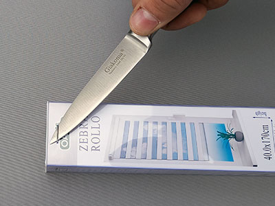 1. Начинаем сборку жалюзи День-Ночь с открытия упаковки со стороны цветной этикетки (под ней находятся все крепления). Аккуратно поддеваете скрепки лезвием ножа и удаляете их полностью.