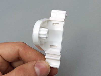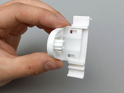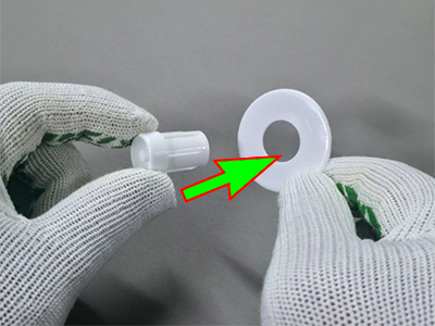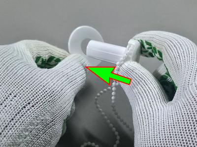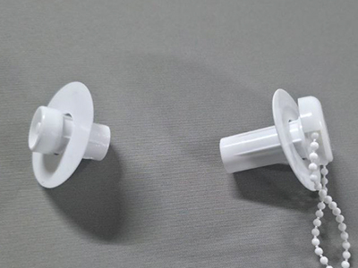 3. Одеваем пластиковые шайбы на втулку и цепочный механизм. Правильно одевать так, чтобы красивая и гладкая поверхность шайб располагалась к полотну ткани. Они служат направляющими при сматывании шторы в рулон.