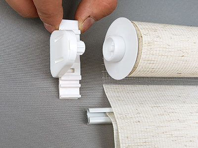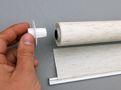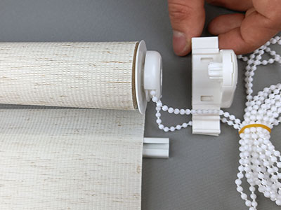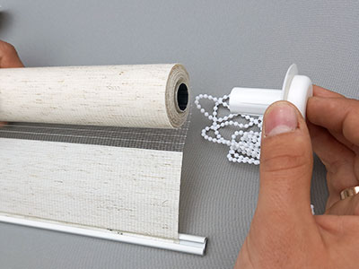 4. Собираем рулонную штору День-Ночь. Вставляем в трубу с тканью на одну сторону механизм с веревкой из бусинок, а на другую сторону пластиковую втулку. Цепочный механизм управления универсальный. Поэтому если вам нужно управление справа собираем его справа, а если слева то соответственно слева.