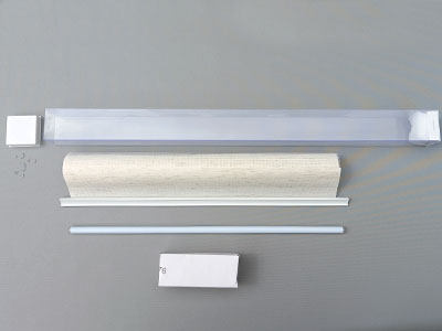 Достаём ролету День Ночь смотанную в рулон на алюминиевой трубе, бумажную коробочку с комплектующими и трубку утяжелитель.