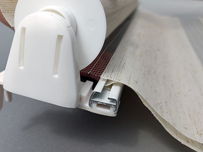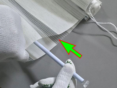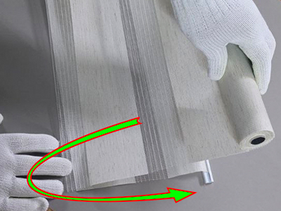 5. Теперь берём ролеты День Ночь и немного разматываем рулон. Вы увидите что ткань начинается с алюминиевой планки. Эту планку с тканью нужно завернуть вторым слоем на заднюю часть жалюзи.
