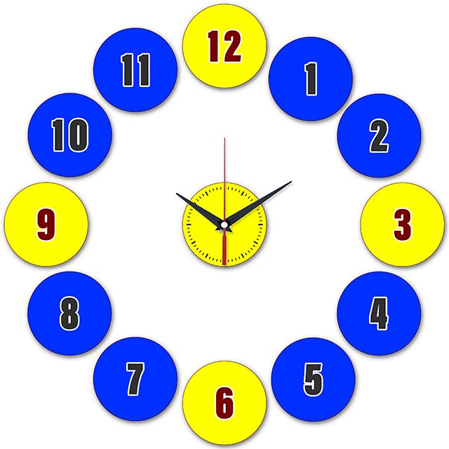 Часы с большими цифрами на желто-синем фоне.