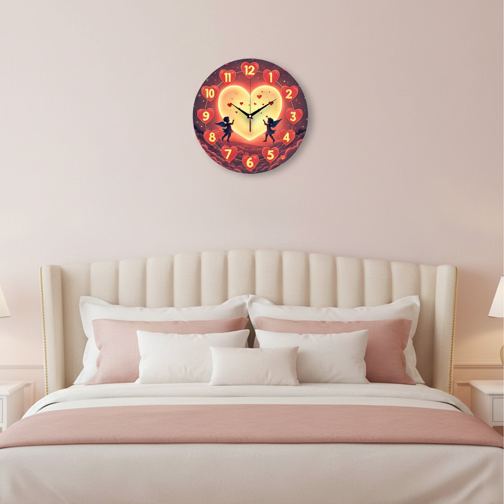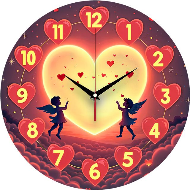 «Ангелы Валентина» — романтичные, сказочные настенные часы с силуэтами ангелов на фоне большого светящегося сердца-луны в тёплых красных, оранжевых и жёлтых оттенках. Крупные жёлтые цифры, расположенные на красных сердечках, и контрастные тёмные стрелки хорошо читаются. Подходит для спальни, гостиной и станет прекрасным подарком для любимого человека на День святого Валентина, годовщину или свадьбу. Смотрите все настенные часы.