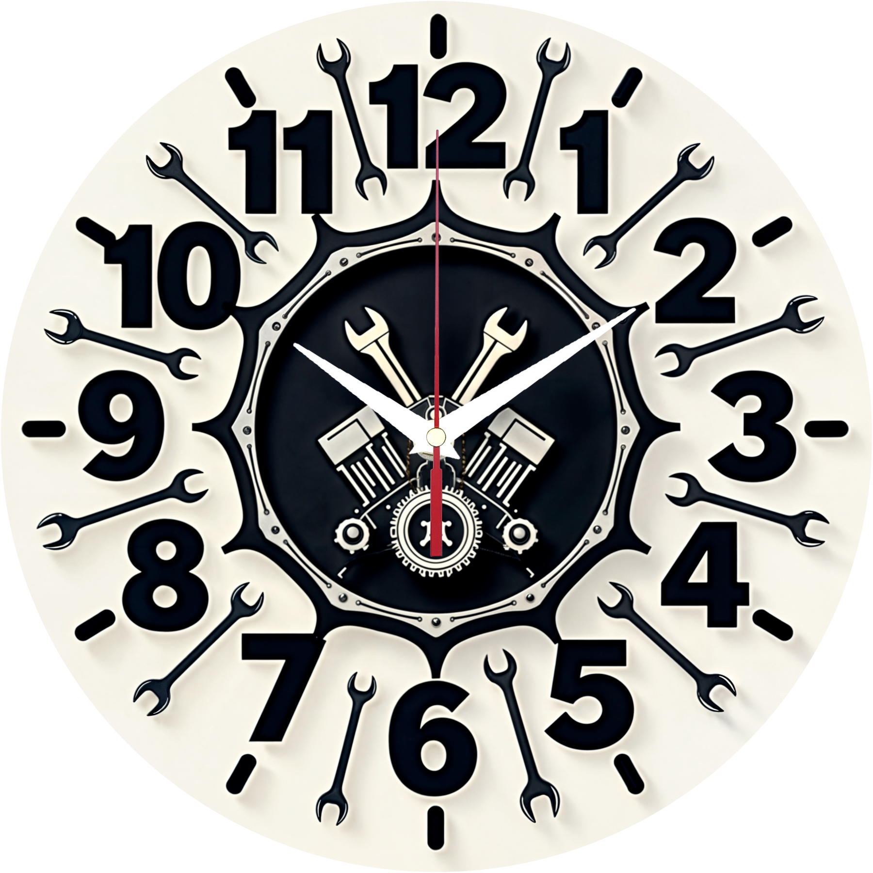 «Автомастерская» — брутальные, тематические настенные часы с изображением V-образного двигателя и гаечных ключей в стиле автологотипа, в чёрных, белых и металлических оттенках. Крупные чёрные арабские цифры, гаечные ключи вместо меток и контрастные белые стрелки прекрасно читаются. Подходит для гаража, автомастерской, бара или мужской берлоги и станет отличным подарком для автомеханика, байкера или любителя техники. Покупайте в нашем интернет-магазине настенных часов.