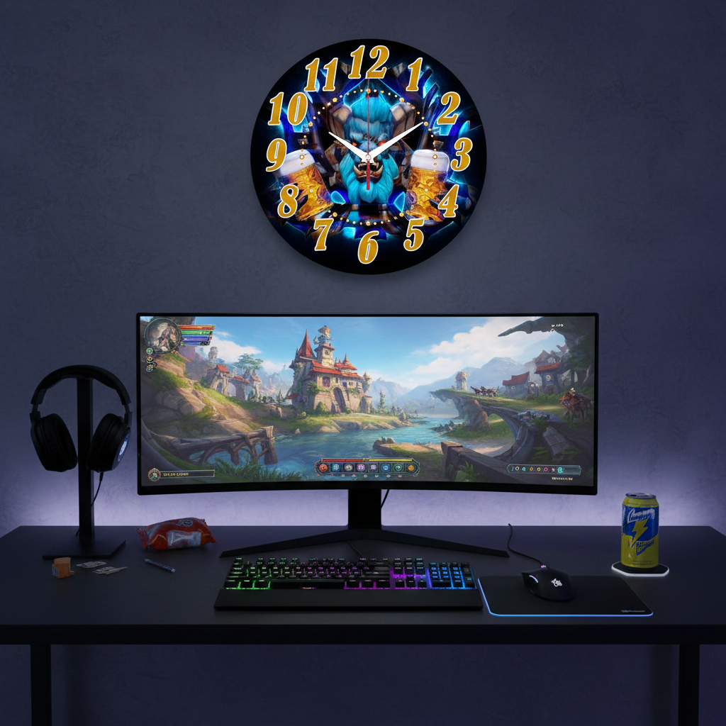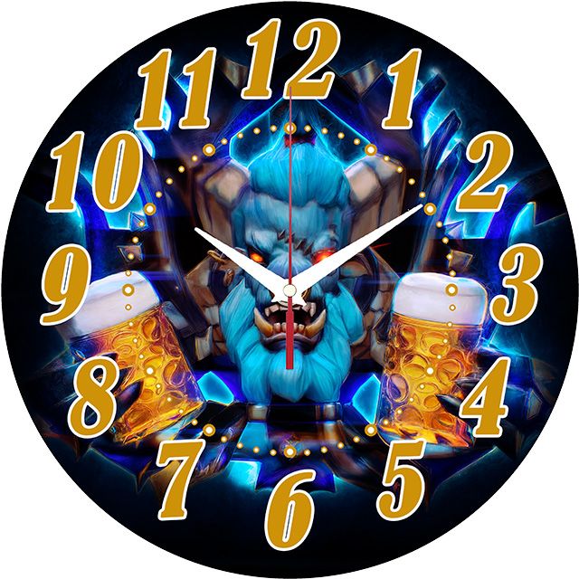«Баратрум» — брутальные игровые настенные часы с изображением героя Dota 2 Spirit Breaker (Баратрум) и кружками пива на фоне синих кристаллов, в синих, золотых и чёрных оттенках. Крупные золотые цифры с белой окантовкой и контрастные белые стрелки хорошо читаются. Подходит для комнаты геймера, игровой зоны или тематического бара и станет отличным подарком для поклонника Dota 2 или киберспортсмена. Смотрите всю подборку настенных часов.