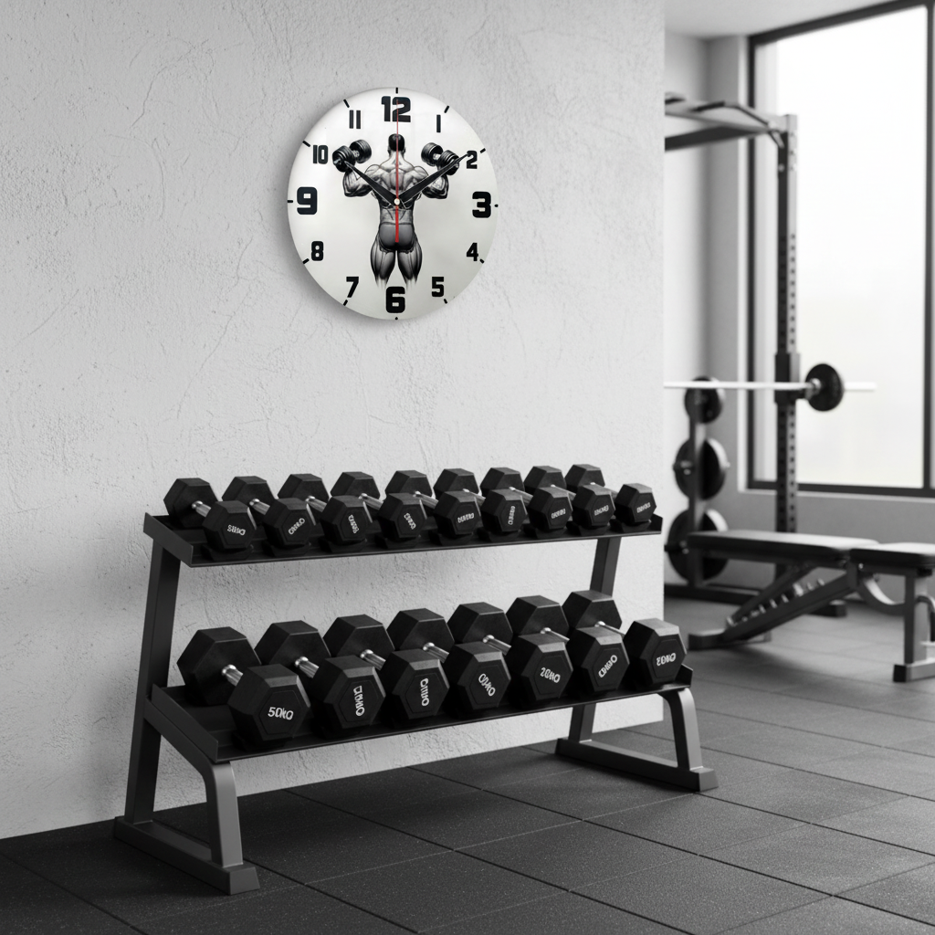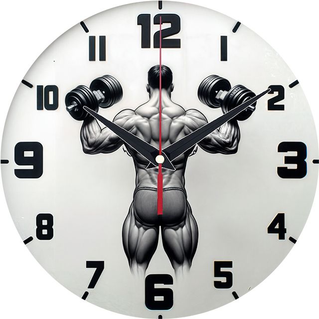 «Бодибилдер» — мотивирующие, брутальные настенные часы с изображением атлета-бодибилдера с гантелями (вид со спины) в монохромных чёрно-белых оттенках. Крупные чёрные цифры и контрастные тёмные стрелки хорошо читаются на светлом фоне. Подходит для спортивного зала, фитнес-клуба, домашнего спорт-уголка и станет отличным подарком для спортсмена, бодибилдера, тренера или любителя силовых тренировок. Смотрите полный список настенных часов.