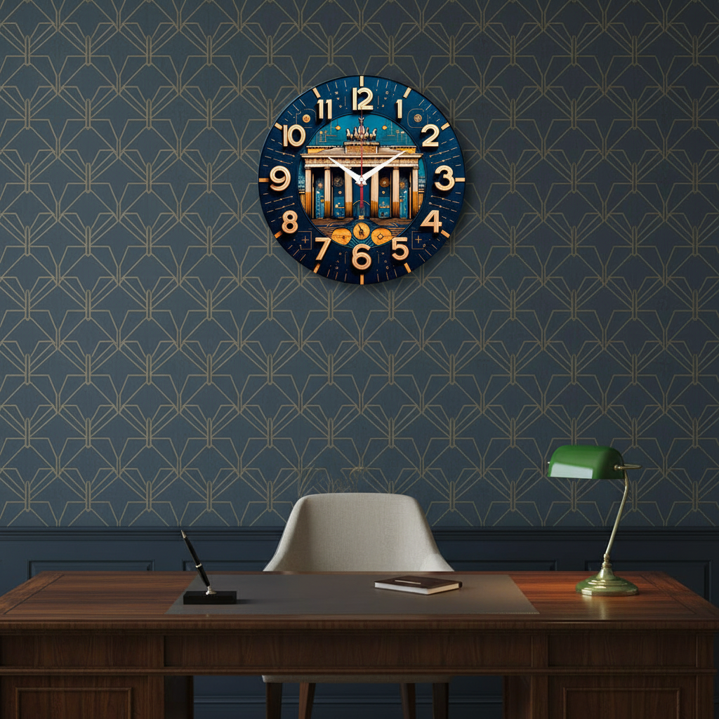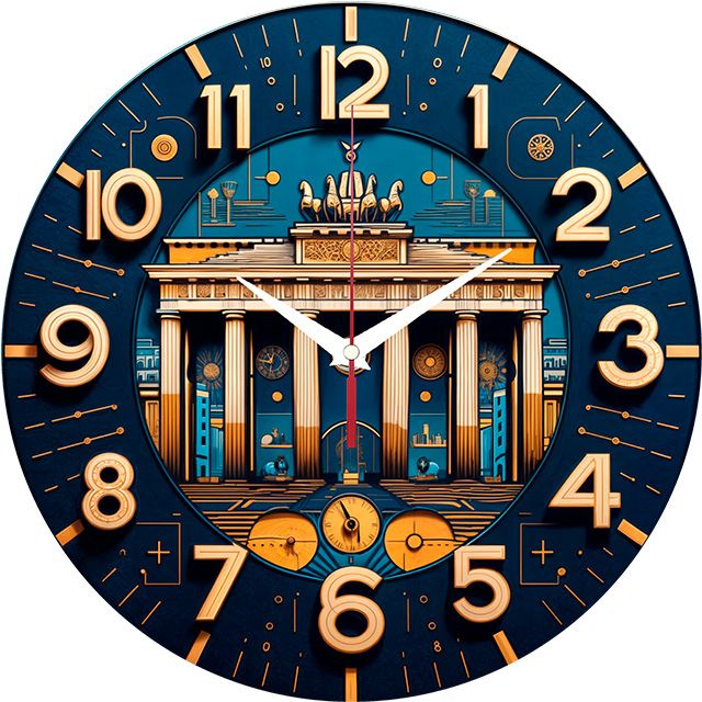 «Бранденбургские ворота» — величественные, стильные настенные часы со стилизованным изображением Бранденбургских ворот в стиле ар-деко, в насыщенных синих, золотых и охристых оттенках. Крупные объёмные золотые цифры и контрастные белые стрелки прекрасно читаются. Подходит для кабинета, гостиной в стиле ар-деко, офиса или холла и станет отличным подарком для ценителя архитектуры, истории или стиля ар-деко. Перейдите в главную категорию настенных часов.