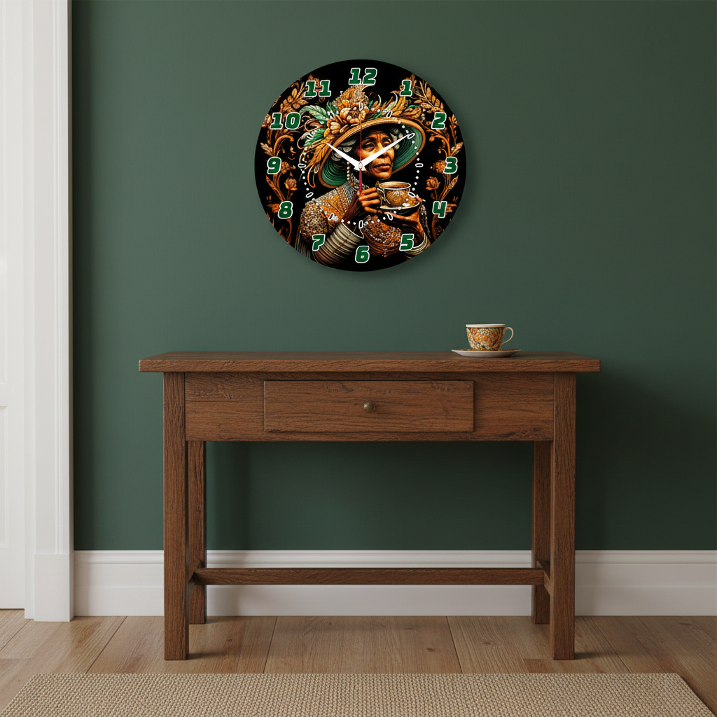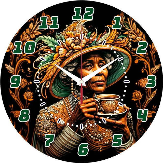 «Чайная леди» — элегантные, винтажные настенные часы с портретом пожилой леди с чашкой чая в шляпе и роскошном наряде, с золотым орнаментом в чёрных, золотых, зелёных и оранжевых оттенках. Крупные зелёные цифры с белой окантовкой и контрастные белые стрелки хорошо читаются на тёмном фоне. Подходит для гостиной, кабинета, кафе в винтажном стиле и станет отличным подарком для ценителей искусства, винтажного стиля или любителей чая. Смотрите другие Настенные часы для гостиной.
