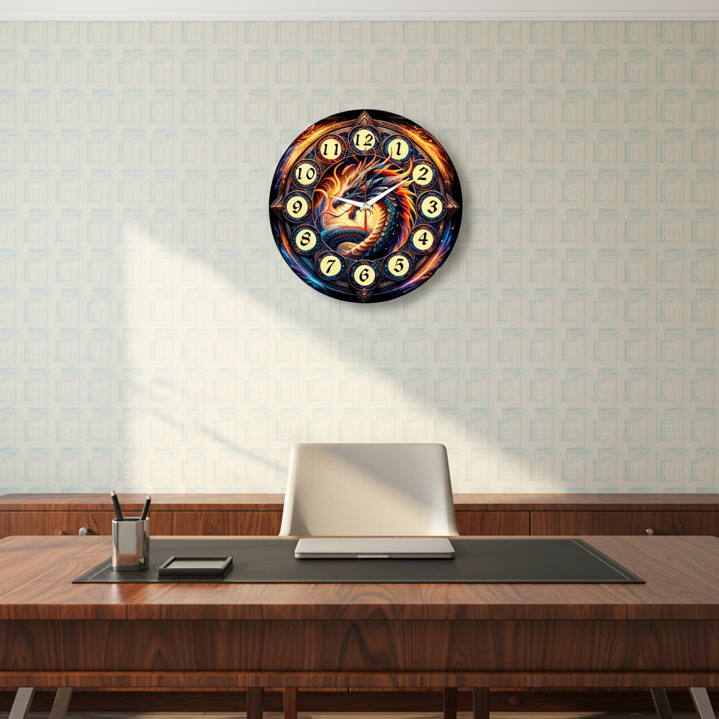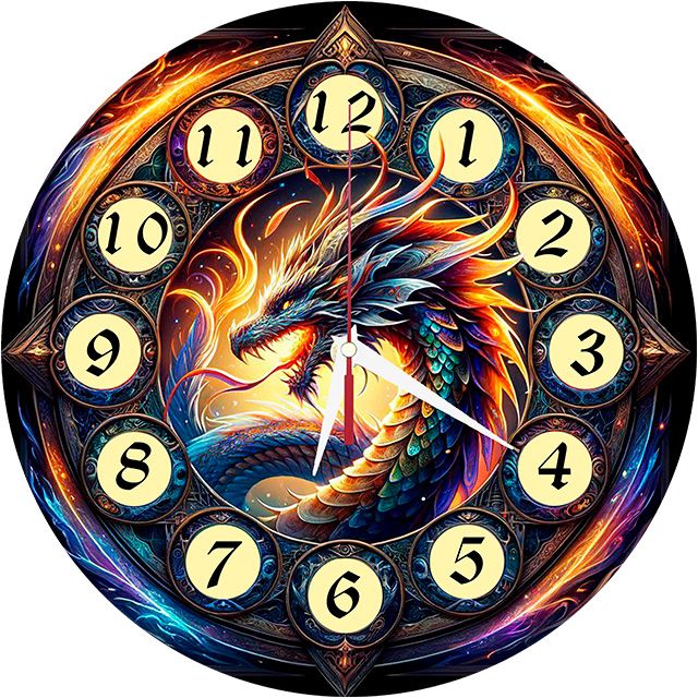 «Дракон вихрь» — эпичные, фэнтезийные настенные часы с изображением могущественного дракона в сложном орнаментальном круге, в ярких синих, оранжевых и золотых оттенках. Классические арабские цифры в золотых медальонах и контрастные белые стрелки прекрасно читаются. Подходит для комнаты геймера, гостиной в стиле фэнтези или лофта и станет отличным подарком для поклонника драконов, фэнтези или эпических саг. Смотрите всю категорию «настенные часы».