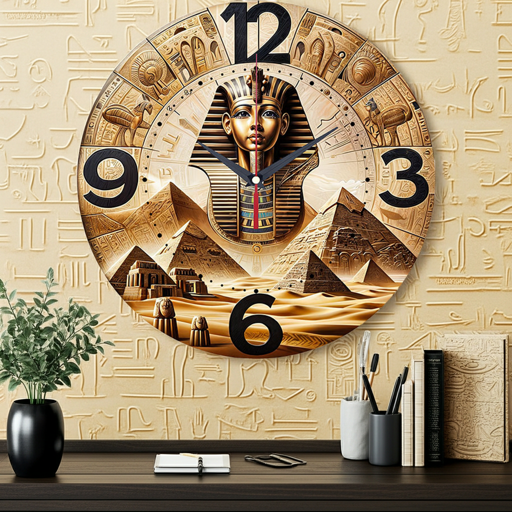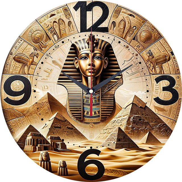 «Египетский стиль» — величественные, исторические настенные часы с изображением маски Тутанхамона на фоне пирамид и пустыни, с богатым орнаментом из иероглифов, в золотых, бежевых, коричневых и чёрных оттенках. Крупные чёрные цифры (3, 6, 9, 12) и контрастные тёмные стрелки прекрасно читаются. Подходит для классического кабинета, гостиной в египетском или этническом стиле, тематического пространства и станет отличным подарком для ценителя истории, Древнего Египта, роскошного декора или путешественника. Смотрите полный список настенных часов.