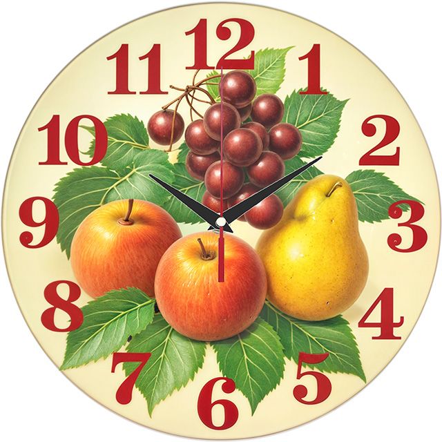 «Фруктовый натюрморт» — аппетитные, классические настенные часы с живописным натюрмортом (яблоки, груша, вишни) в тёплых красных, жёлтых и зелёных оттенках. Крупные красные цифры и контрастные тёмные стрелки прекрасно читаются на светлом фоне. Подходит для кухни, столовой или дачи в стиле кантри и станет прекрасным подарком для хозяйки или любителя классических натюрмортов. Смотрите все настенные часы.