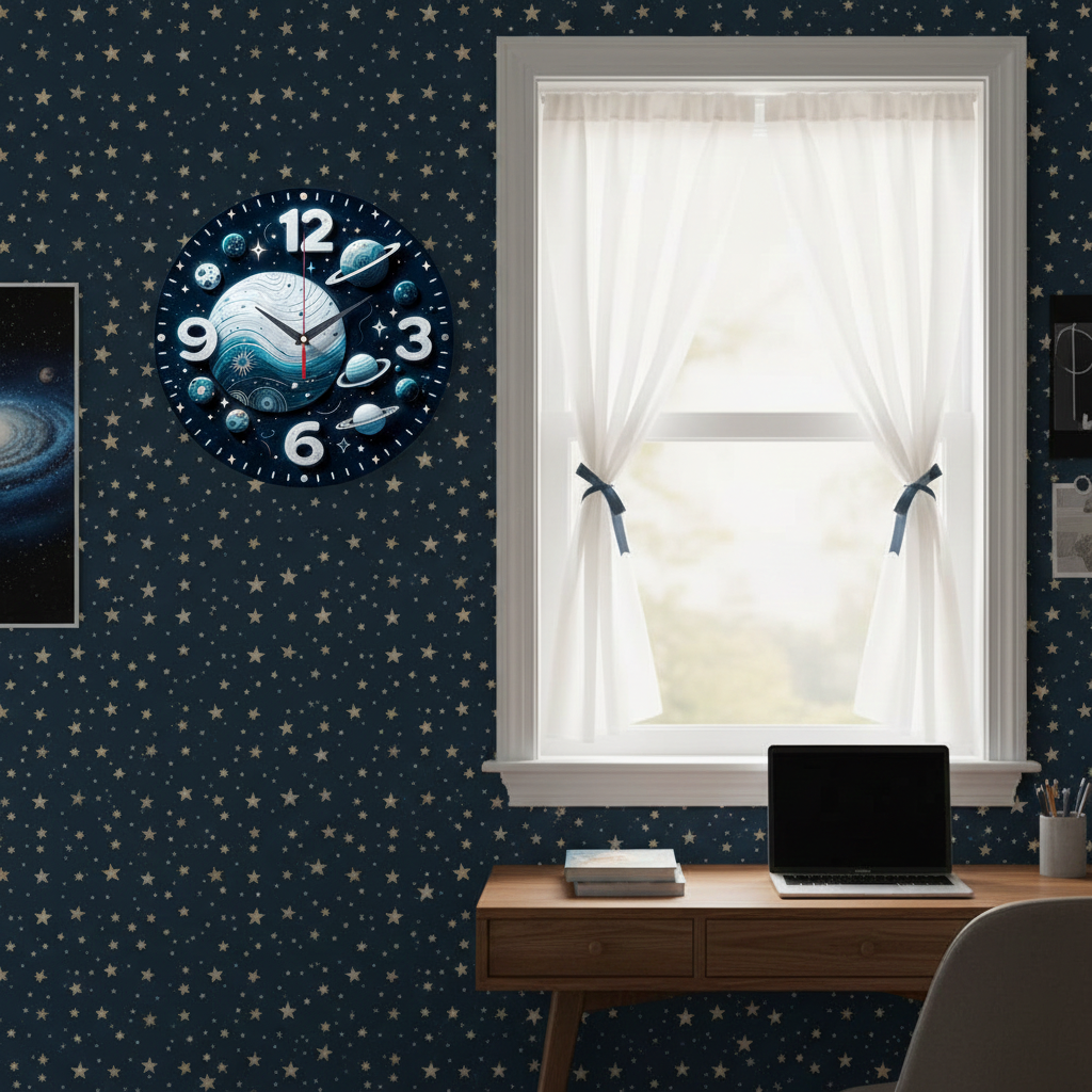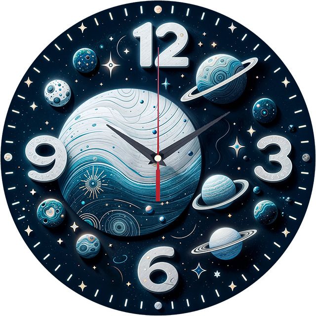 «Галактический меридиан» — завораживающие, космические настенные часы с фантастическим пейзажем галактики с планетами (включая планеты с кольцами) и звёздами в глубоких синих, бирюзовых и белых оттенках. Крупные объёмные белые цифры (3, 6, 9, 12) и контрастные тёмные стрелки прекрасно читаются. Подходит для современной гостиной, комнаты подростка, кабинета или комнаты геймера и станет отличным подарком для любителя космоса, научной фантастики или астрономии. Покупайте в нашем интернет-магазине настенных часов.