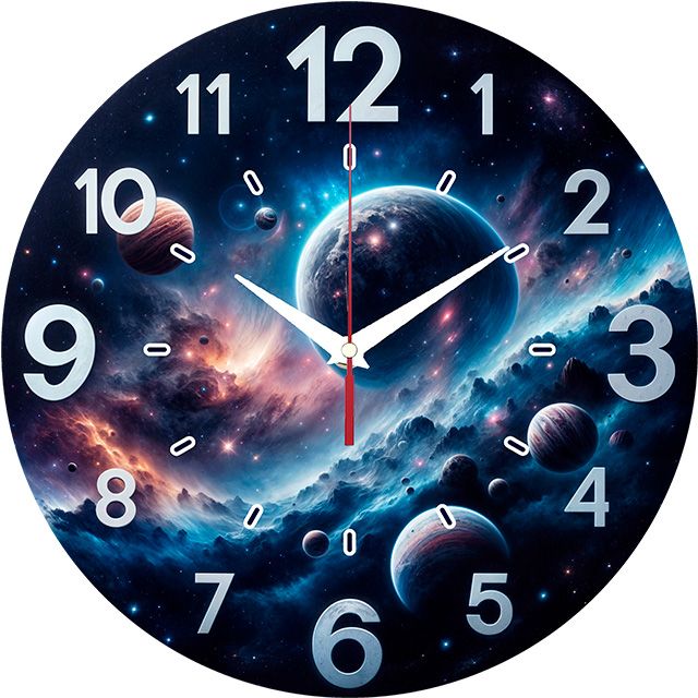 «Галактика» — завораживающие, космические настенные часы с изображением фантастического пейзажа с планетами, туманностями и звёздами в глубоких синих, оранжевых, красных и чёрных оттенках. Крупные объёмные белые цифры и контрастные белые стрелки прекрасно читаются. Подходит для современной гостиной, комнаты подростка, кабинета или комнаты геймера и станет отличным подарком для любителя космоса, научной фантастики или астрономии. Смотрите каталог настенных часов.