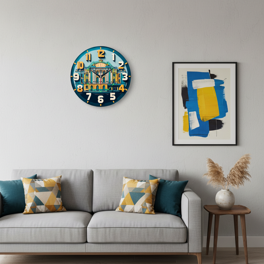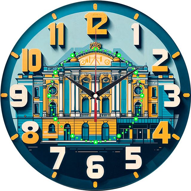 «Городской театр» — яркие, стильные настенные часы со стилизованным изображением городского театра в жёлтых, синих и зелёных тонах с неоновыми акцентами. Крупные объёмные цифры и контрастные тёмные стрелки прекрасно читаются. Подходит для современного интерьера, гостиной, холла, офиса или арт-пространства и станет отличным подарком для театрала, любителя архитектуры или ценителя современного искусства. Смотрите полный каталог настенных часов.