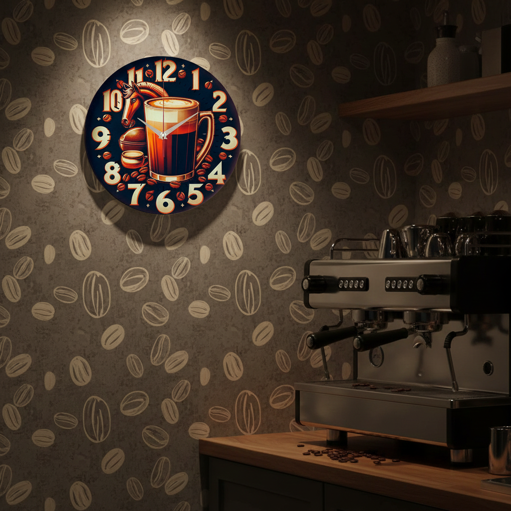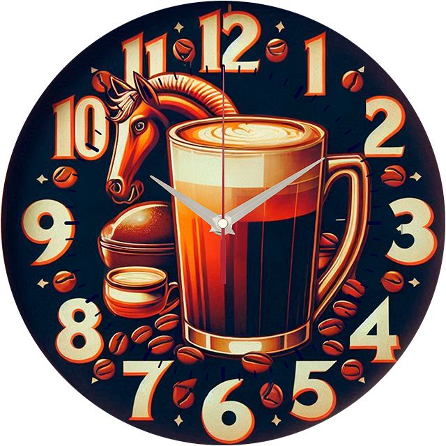 «Кофейная фантазия» — тёплые, креативные настенные часы с фантазийным кофейным натюрмортом, включающим чашки с кофе, зёрна и стилизованную фигуру коня, в насыщенных кофейных, коричневых и бежевых оттенках. Крупные стилизованные цифры и контрастные белые стрелки прекрасно читаются. Подходит для кухни, кофейни, бара или гостиной в стиле ретро и станет отличным подарком для кофемана или ценителя оригинального искусства. Смотрите всю подборку настенных часов.