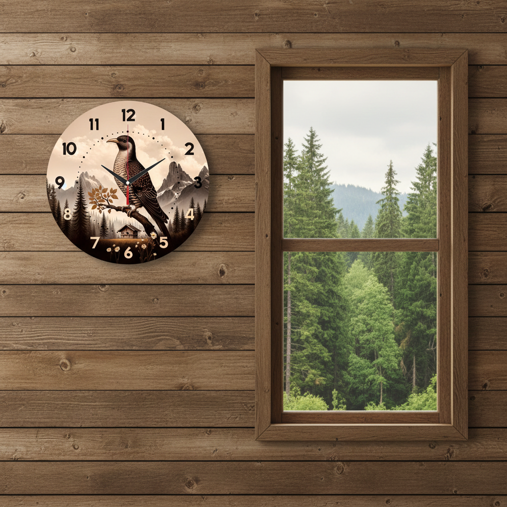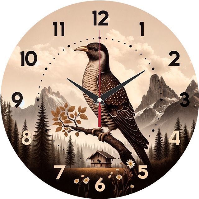 «Кукушка» — уютные, атмосферные настенные часы с изображением кукушки на ветке на фоне горного пейзажа с домиком, в спокойных бежевых, коричневых и серо-зелёных оттенках. Крупные чёрные арабские цифры и контрастные тёмные стрелки прекрасно читаются. Подходит для загородного дома, дачи, кухни в стиле кантри или шале и станет отличным подарком для любителя природы, орнитолога или ценителя деревенского стиля. Выбирайте, где купить настенные часы.