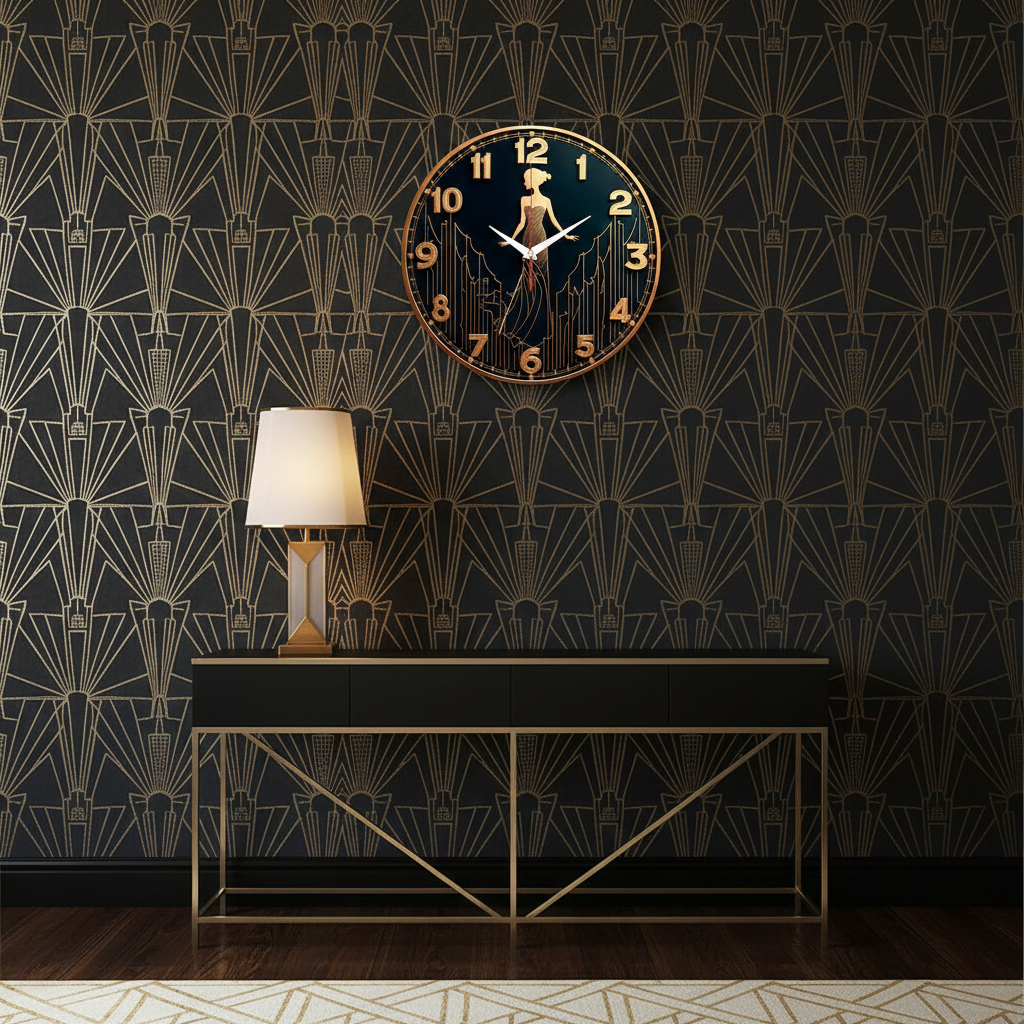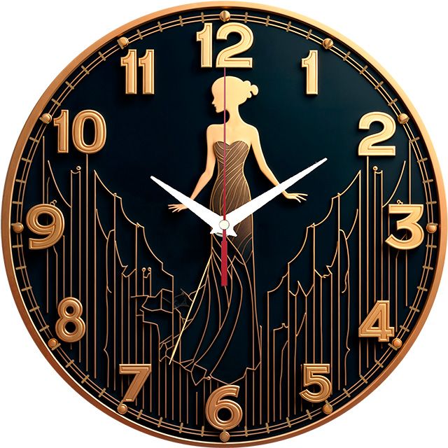 «Леди в платье» — элегантные, роскошные настенные часы с силуэтом дамы в вечернем платье на фоне стилизованного городского пейзажа в стиле ар-деко, в глубоких чёрных и золотых оттенках. Крупные золотые цифры и контрастные белые стрелки прекрасно читаются. Подходит для гостиной в стиле ар-деко, спальни, бутика или салона красоты и станет прекрасным подарком для ценительницы элегантности и моды. Выбирайте, какой выбрать настенные часы.