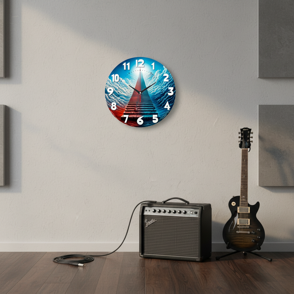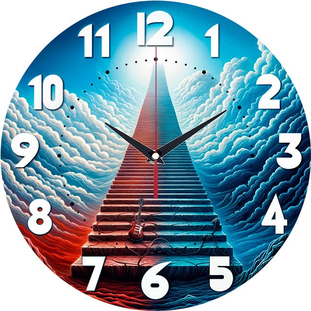 «Лестница в небо» — сюрреалистические, философские настенные часы с изображением бесконечной лестницы, уходящей в облака к свету, с гитарой у подножия, в контрастных красных и синих оттенках. Крупные объёмные белые цифры и контрастные тёмные стрелки хорошо читаются. Подходит для современной гостиной, музыкальной студии, комнаты творческого человека и станет отличным подарком для музыканта, философа или мечтателя. Покупайте в нашем интернет-магазине настенных часов.