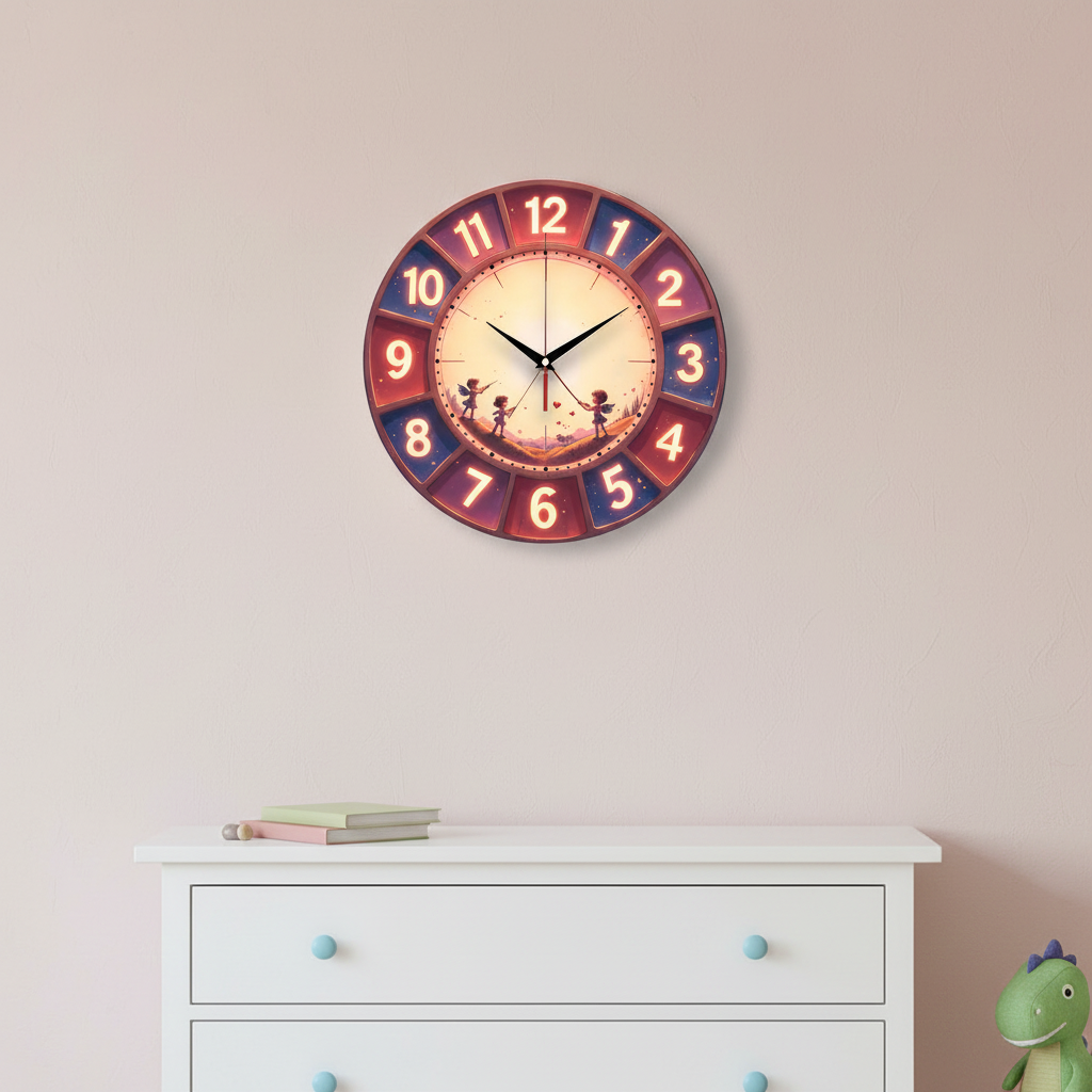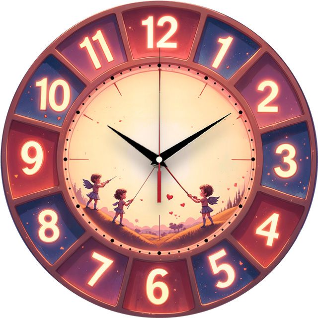 «Маленькие поздравления» — милые, романтичные настенные часы с изображением маленьких ангелов-купидонов на фоне пейзажа, в тёплых красных, розовых и синих оттенках. Крупные "светящиеся" цифры в отдельных окошках и контрастные тёмные стрелки хорошо читаются. Подходит для детской комнаты, спальни и станет прекрасным подарком для ребёнка или на День святого Валентина. Смотрите полный список настенных часов.