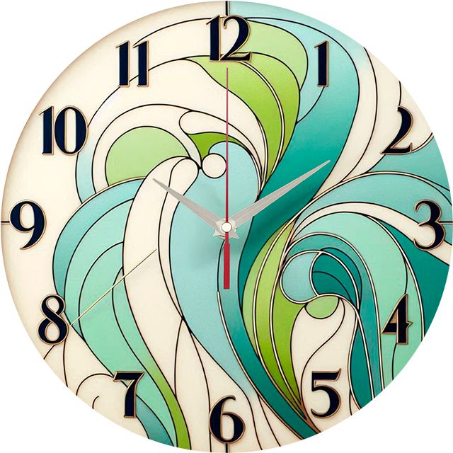 «Морская симфония» — элегантные, умиротворяющие настенные часы с абстрактным дизайном в стиле модерн, напоминающим морские волны или витраж, в нежных бирюзовых, зелёных и бежевых оттенках. Крупные тёмные арабские цифры и контрастные тёмные стрелки прекрасно читаются. Подходит для гостиной, спальни, ванной комнаты в морском стиле или студии йоги и станет прекрасным подарком для ценителя стиля модерн или любителя морской тематики. Покупайте лучшие в нашем интернет-магазине настенных часов.