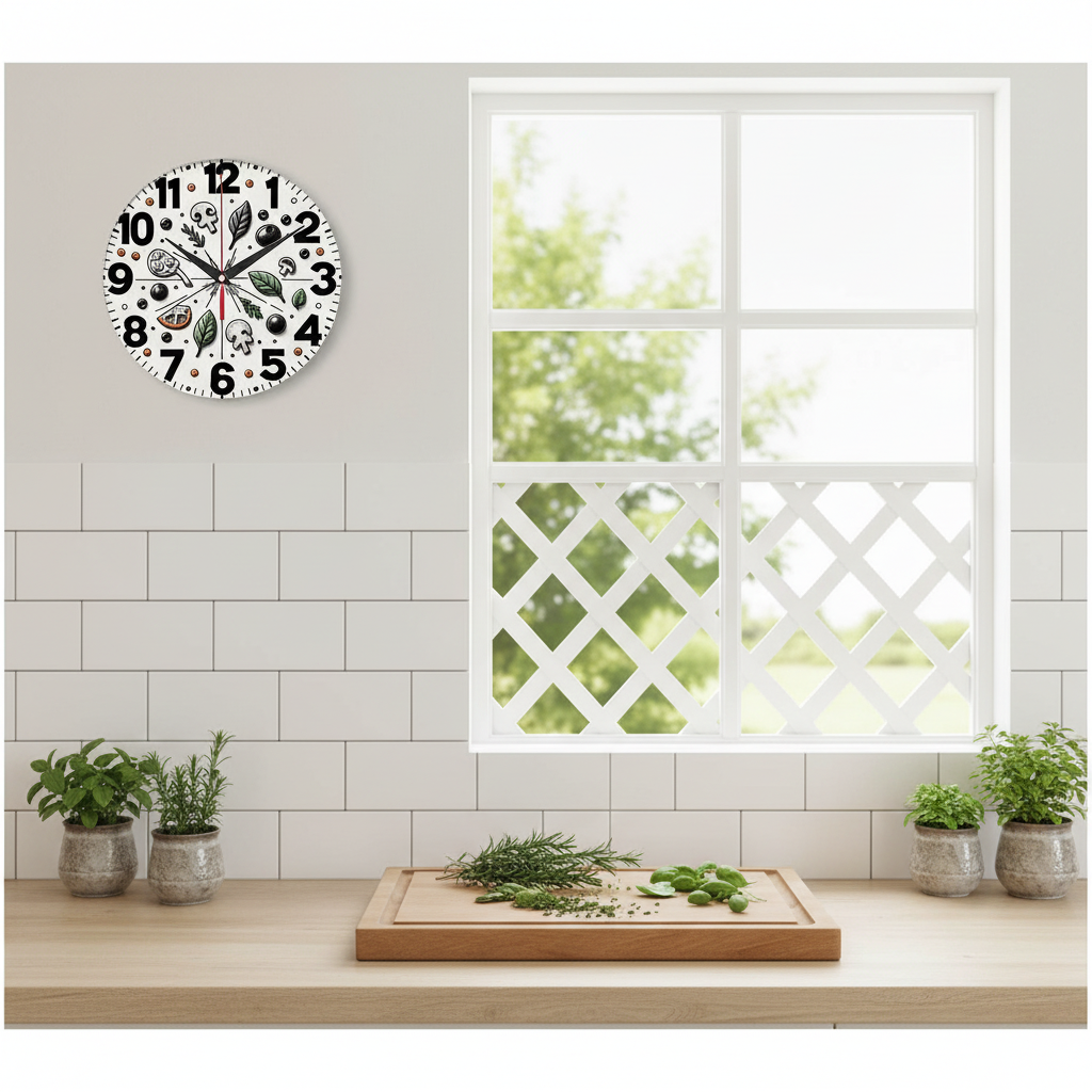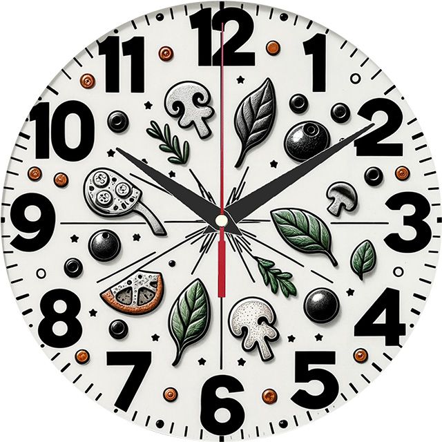 «Овощной микс» — весёлые кухонные настенные часы с изображением различных ингредиентов (грибы, шпинат, ягоды, пицца) и утвари (сковорода) в чёрных, белых и зелёных оттенках. Крупные чёрные арабские цифры и контрастные тёмные стрелки хорошо читаются на белом фоне. Подходит для кухни, столовой, кафе или пиццерии и станет отличным подарком для повара, кулинара, любителя пиццы или хозяйки. Смотрите другие часы на стену.