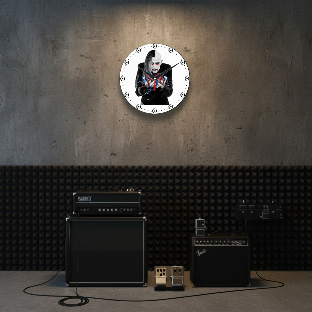 «Perfect Circle» — мистические арт-рок настенные часы с культовым изображением вокалиста группы A Perfect Circle, держащего сердце-осьминога, в монохромных чёрно-белых тонах с красными и синими акцентами. Стилизованные символы вместо цифр и тёмные стрелки дополняют готический образ. Подходит для комнаты фаната группы, студии звукозаписи или интерьера в стиле готика/лофт и станет отличным подарком для поклонника A Perfect Circle или любителя арт-рока. Смотрите весь ассортимент настенных часов.