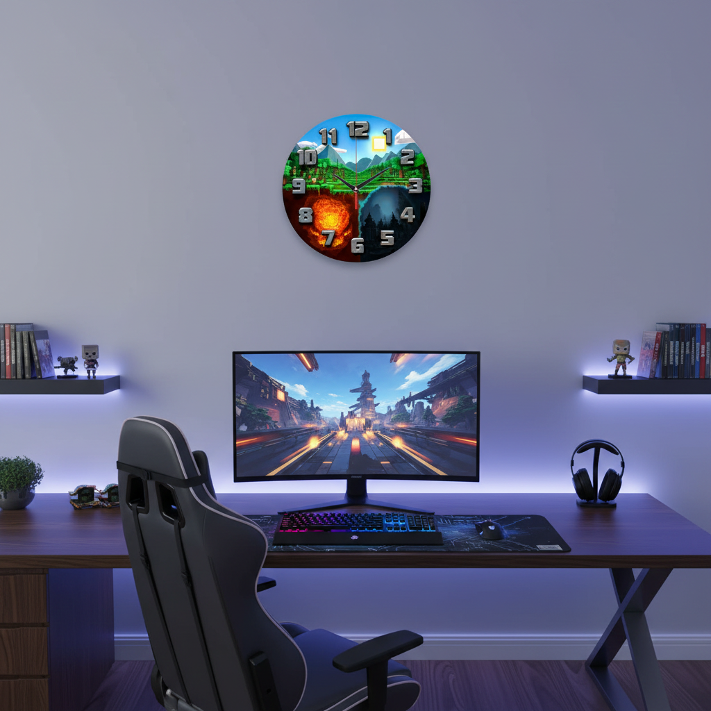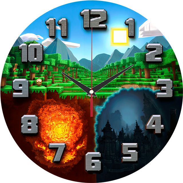 «Пиксельный мир» — захватывающие, игровые настенные часы с изображением трёх миров в пиксельном стиле (верхний мир, огненный ад и тёмное подземелье) в зелёных, синих, оранжевых и серых оттенках. Крупные объёмные металлические цифры и контрастные тёмные стрелки хорошо читаются. Подходит для детской комнаты, игровой зоны или комнаты геймера и станет отличным подарком для поклонника видеоигр или пиксельной графики. Смотрите полный список настенных часов.