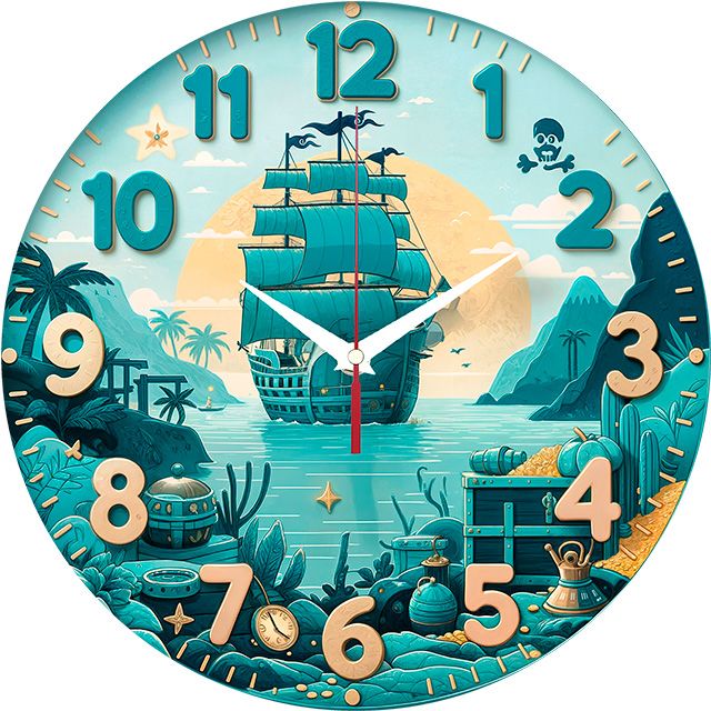 «Пиратское приключение» — захватывающие, детские настенные часы с изображением пиратского корабля у острова сокровищ в ярких бирюзовых, синих и бежевых оттенках. Объёмные цифры с текстурой дерева и контрастные белые стрелки хорошо читаются на фоне морского пейзажа. Подходит для детской комнаты мальчика, игровой зоны или комнаты в морском стиле и станет отличным подарком для юного искателя приключений. Перейдите в главную категорию настенных часов.