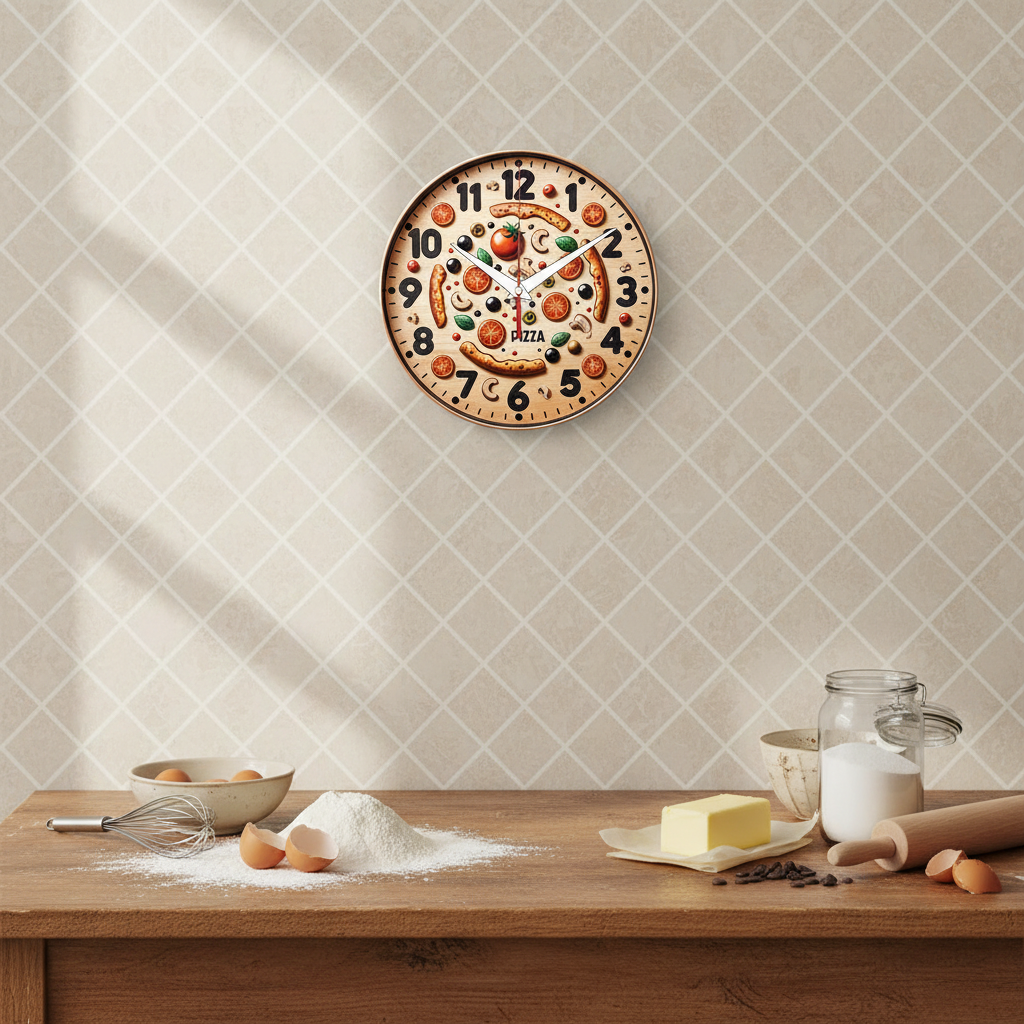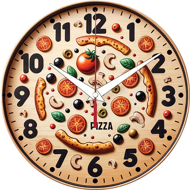 «Пицца» — аппетитные, весёлые настенные часы с гиперреалистичным изображением ингредиентов для пиццы (помидоры, грибы, оливки, колбаски, базилик), разложенных на деревянной доске, в бежевых, красных, зелёных и коричневых оттенках. Крупные чёрные арабские цифры и контрастные белые стрелки хорошо читаются на фоне. Подходит для кухни, пиццерии, кафе или столовой и станет отличным подарком для любителя пиццы, повара или хозяина пиццерии. Смотрите другие настенные часы для кухни.