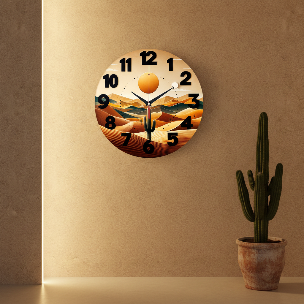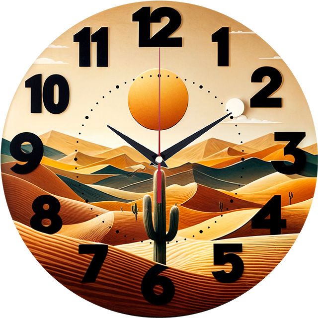 «Пустыня» — тёплые, атмосферные настенные часы со стилизованным пейзажем пустыни с дюнами, кактусами и солнцем в тёплых песочных, оранжевых и коричневых оттенках. Крупные чёрные арабские цифры и контрастные тёмные стрелки хорошо читаются на фоне. Подходит для гостиной в стиле бохо, кабинета или комнаты путешественника и станет отличным подарком для любителя экзотических пейзажей или стиля вестерн. Смотрите весь раздел настенных часов.