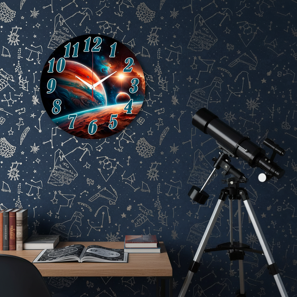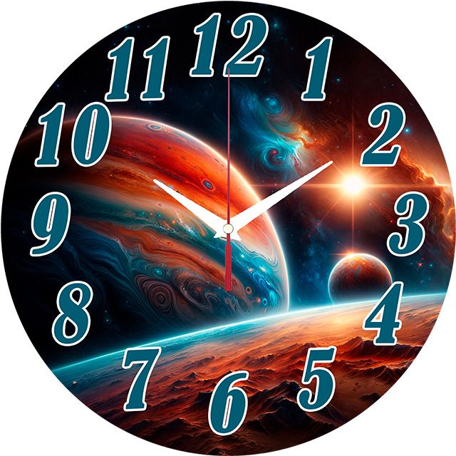 «Путешествие по планетам» — захватывающие, космические настенные часы с изображением фантастического космического пейзажа с планетами, туманностями и звёздами в глубоких синих, оранжевых, красных и бирюзовых оттенках. Крупные сине-зелёные цифры с белой окантовкой и контрастные белые стрелки прекрасно читаются. Подходит для современной гостиной, комнаты подростка, кабинета или комнаты геймера и станет отличным подарком для любителя космоса, научной фантастики или астрономии. Перейдите в главную категорию настенных часов.