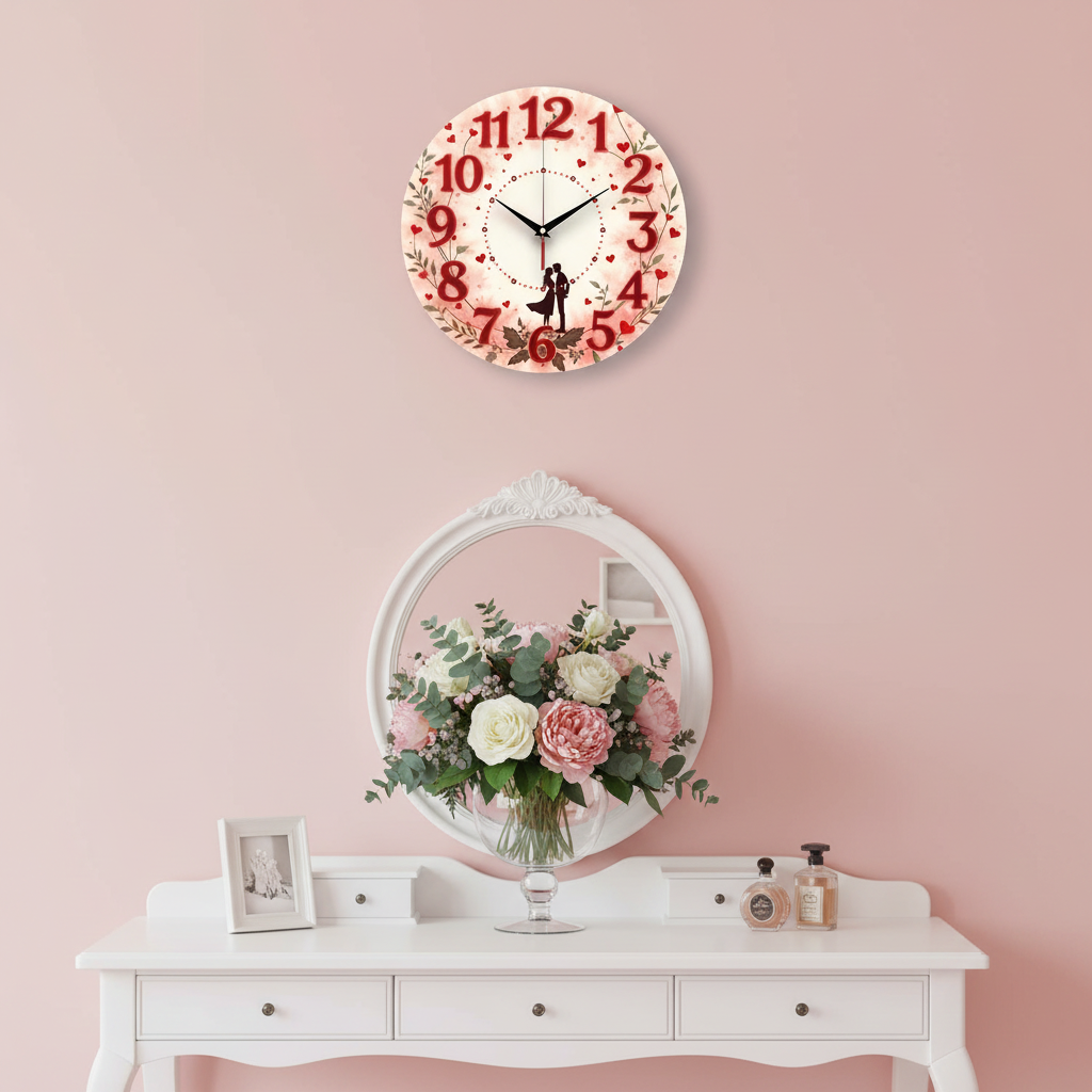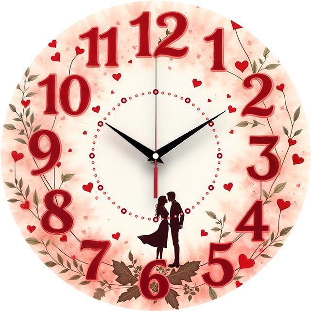«Романтика» — нежные, романтичные настенные часы с силуэтом влюблённой пары в венке из листьев и сердечек на акварельном фоне, в нежных розовых, красных и бежевых оттенках. Крупные красные цифры и контрастные тёмные стрелки хорошо читаются. Подходит для спальни, гостиной и станет прекрасным подарком для влюблённых на День святого Валентина, свадьбу или годовщину. Выбирайте, какой выбрать настенные часы.