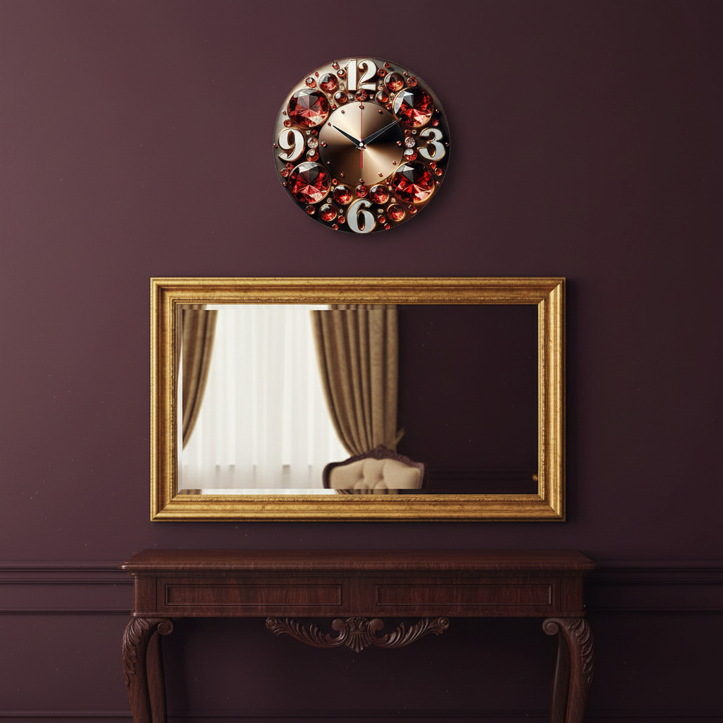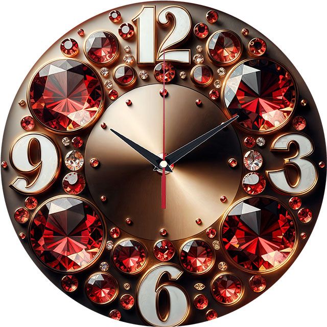 «Рубины» — роскошные, гламурные настенные часы с декором из сияющих рубинов и бриллиантов на металлическом бронзовом фоне, в насыщенных красных, золотых и белых оттенках. Крупные белые цифры (12, 3, 6, 9) и контрастные тёмные стрелки прекрасно читаются. Подходит для гостиной, спальни, ювелирного магазина или салона красоты и станет прекрасным подарком для ценителя роскоши, ювелирных украшений или ярких акцентов. Выбирайте лучшие настенные часы — интернет-магазин.