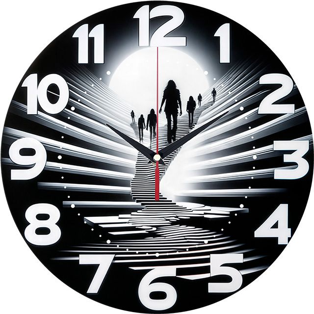 «Шаги в бесконечность» — загадочные, философские настенные часы с сюрреалистическим изображением силуэтов людей, идущих по лестнице к свету, в монохромных чёрно-белых оттенках. Крупные объёмные белые цифры и контрастные тёмные стрелки прекрасно читаются. Подходит для современного интерьера, гостиной, кабинета, студии и станет отличным подарком для философа, психолога или ценителя сюрреализма. Смотрите полный список настенных часов.