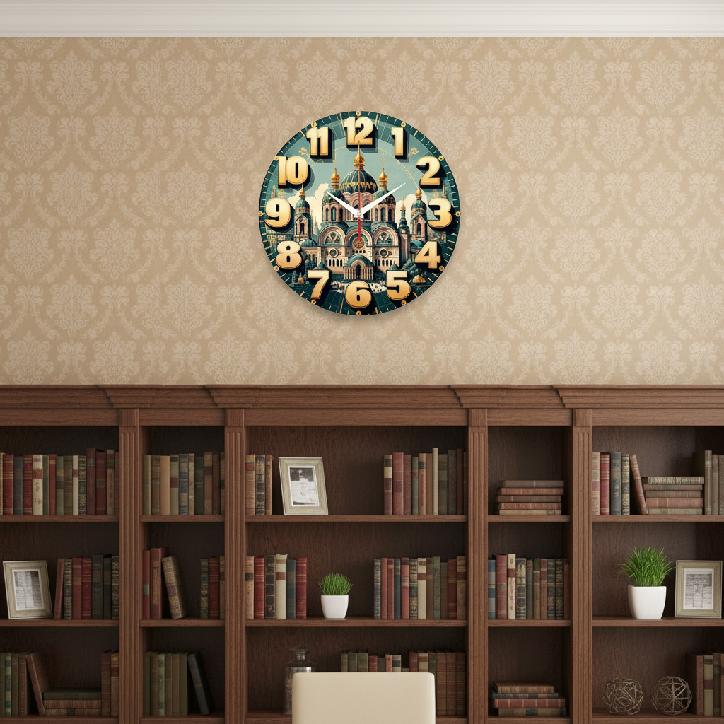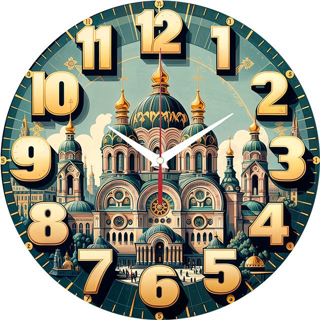 «Собор» — величественные, городские настенные часы со стилизованным изображением собора на фоне абстрактного неба, в золотых, зелёных, синих и бежевых оттенках. Крупные объёмные золотые цифры и контрастные белые стрелки прекрасно читаются. Подходит для классического кабинета, гостиной, библиотеки и станет отличным подарком для ценителя архитектуры, истории или как сувенир из города. Смотрите полный список настенных часов.