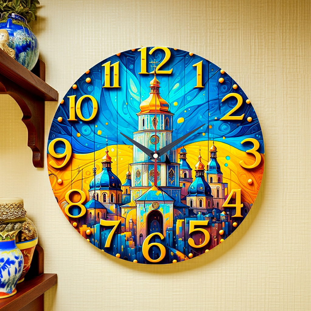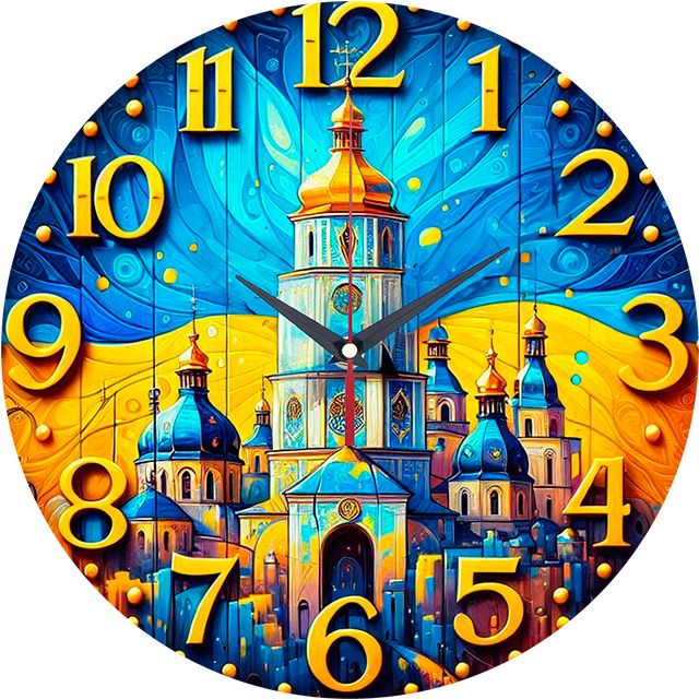 «Украинский стиль» — яркие, патриотические настенные часы со стилизованным изображением киевских соборов (как София или Михайловский) на фоне в цветах украинского флага, в насыщенных синих, жёлтых и золотых оттенках. Крупные жёлтые цифры и контрастные тёмные стрелки прекрасно читаются. Подходит для гостиной, кабинета, офиса или общественного пространства и станет отличным патриотическим подарком, сувениром из Украины или подарком для ценителя украинской культуры. Смотрите полный каталог настенных часов.