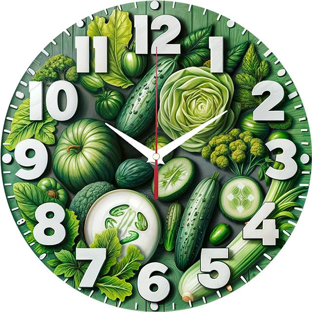 «Зеленые овощи» — свежие, аппетитные настенные часы с гиперреалистичным коллажем из разнообразных зелёных овощей (капуста, огурцы, брокколи, тыква) в насыщенных зелёных и белых оттенках. Крупные объёмные белые цифры и контрастные белые стрелки прекрасно читаются. Подходит для кухни, столовой, вегетарианского кафе или дачи и станет отличным подарком для сторонника здорового питания, вегетарианца или садовода. Выбирайте, какой выбрать настенные часы.