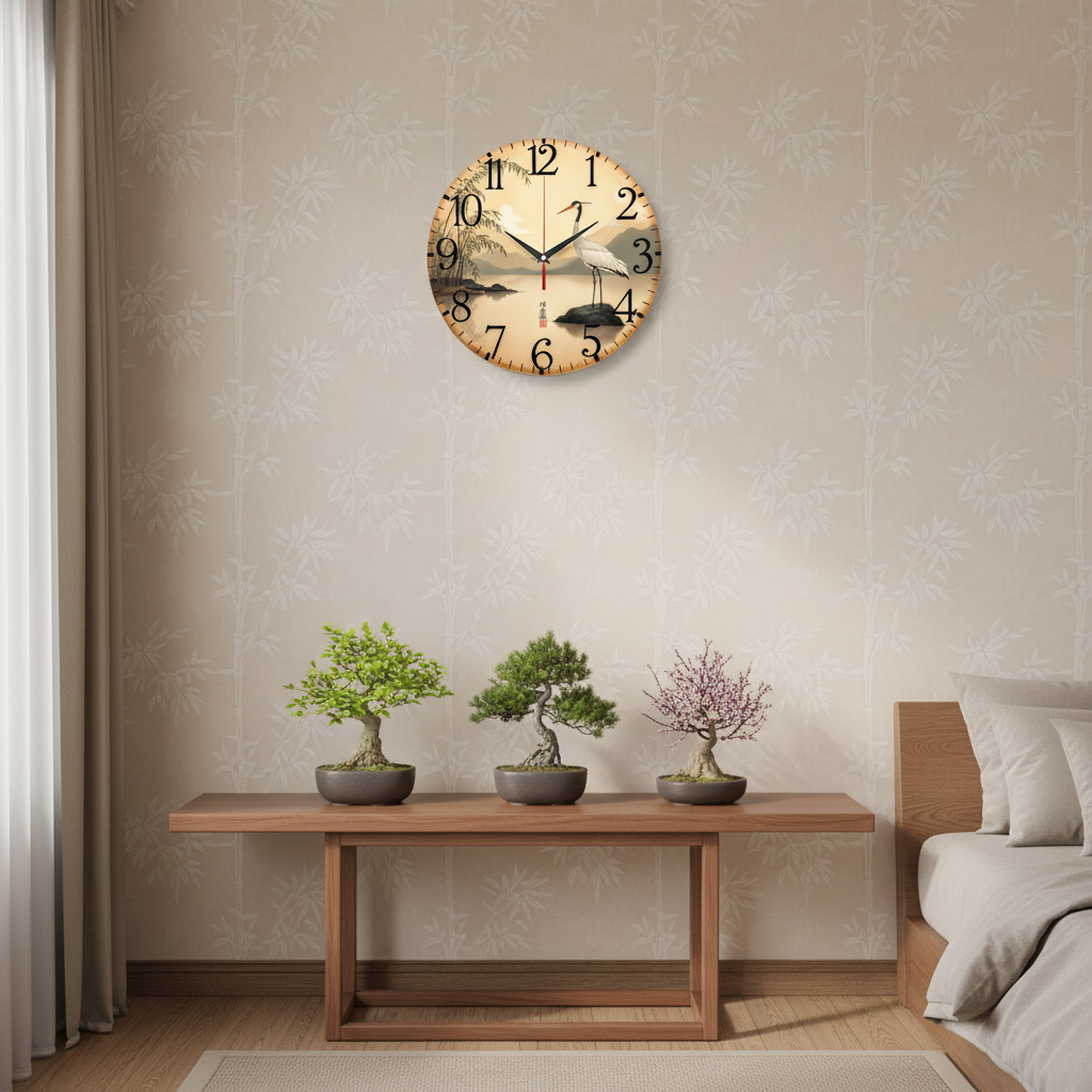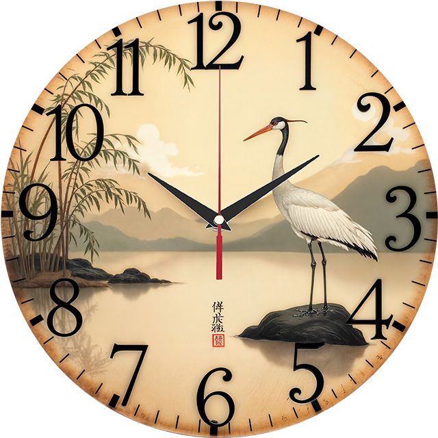 «Журавль на озере» — умиротворяющие настенные часы с живописным пейзажем в азиатском стиле, изображающим журавля на камне у озера среди гор и бамбука, в спокойных бежевых, зелёных и серых оттенках. Крупные чёрные арабские цифры и контрастные тёмные стрелки прекрасно читаются. Подходит для гостиной, спальни, кабинета или интерьера в восточном стиле (дзен) и станет прекрасным подарком для ценителя природы, спокойствия или восточной эстетики. Перейдите в главную категорию настенных часов.