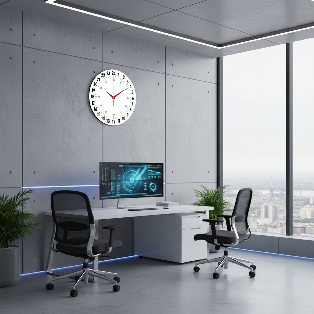 «24 часа» — функциональные минималистичные настенные часы с 24-часовым циферблатом: внешнее кольцо 1–24 и минутная шкала на белом фоне. В оттенках белого, графитового и чёрного с аккуратным красным акцентом. Крупные контрастные цифры и лаконичные тёмные стрелки читаются мгновенно. Особый механизм: часовая стрелка делает полный оборот за сутки (24 ч) — удобно для «military time», расписаний, диспетчерских и студий. Подходит для офиса, кухни, класса и домашнего кабинета и станет практичным подарком перфекционистам, айтишникам и тимлидам. Если близок такой чёткий формат времени, загляните в подборку оригинальные настенные часы.