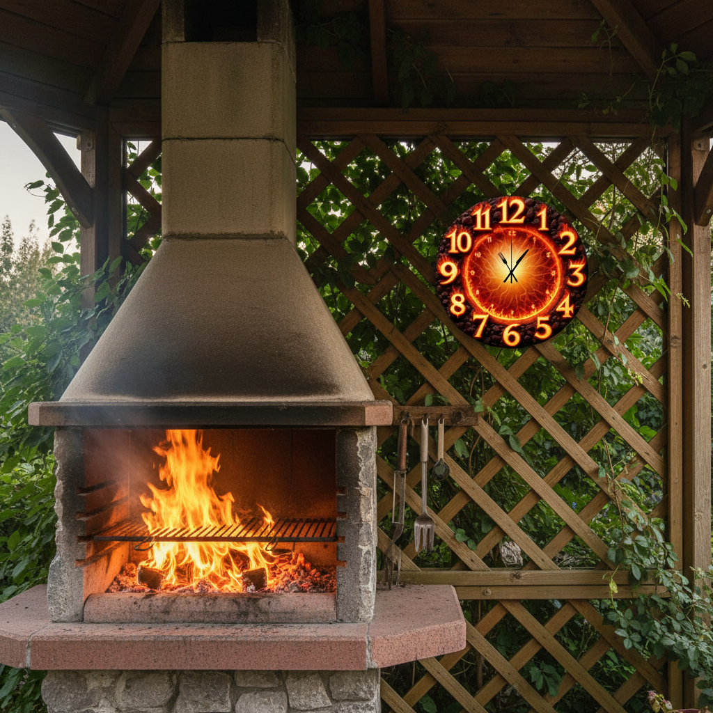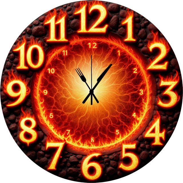 «Адская кухня» — эффектные настенные часы с огненным сюжетом: лавовый вихрь в центре и кайма из обожжённых камней; по кругу — крупные объёмные цифры с пламенным свечением. Палитра — вулканический оранжево-красный, янтарный и чёрный обсидиан. Стрелки выполнены в виде столовых приборов — вилки и ножа — читаются с первого взгляда. Подходит для кухни, гриль-зоны, барбекю-пространства, стейк-хауса, барбершопа или «ман-кейва»; отличный подарок гурманам, шефам и любителям горячих акцентов. Больше подобных моделей смотрите в подборке настенные часы.