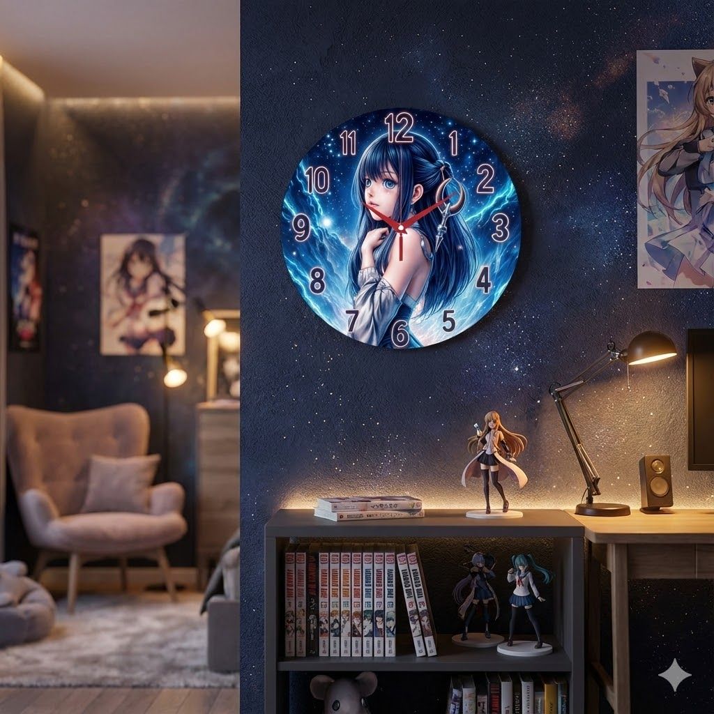 «Аниме тян» — Стильные настенные часы с изображением очаровательной девушки в стиле аниме на фоне звездного неба, выполненные в глубоких синих и голубых оттенках. Циферблат дополнен крупными арабскими цифрами с эффектом свечения и контрастными красными стрелками. Модель идеально подходит в детскую, в спальню или в комнату и станет оригинальным подарком для подростков и ценителей японской культуры, которым мы предлагаем эти настенные купить часы для украшения интерьера.