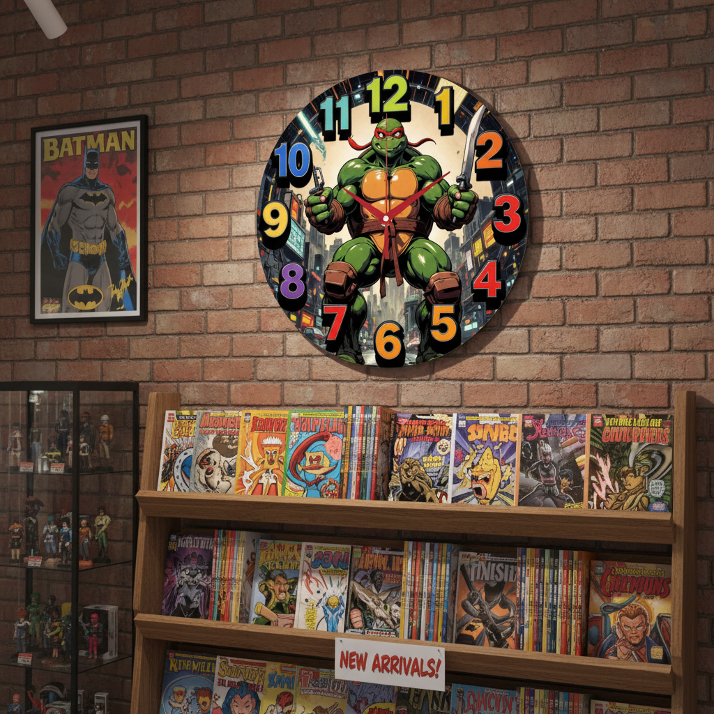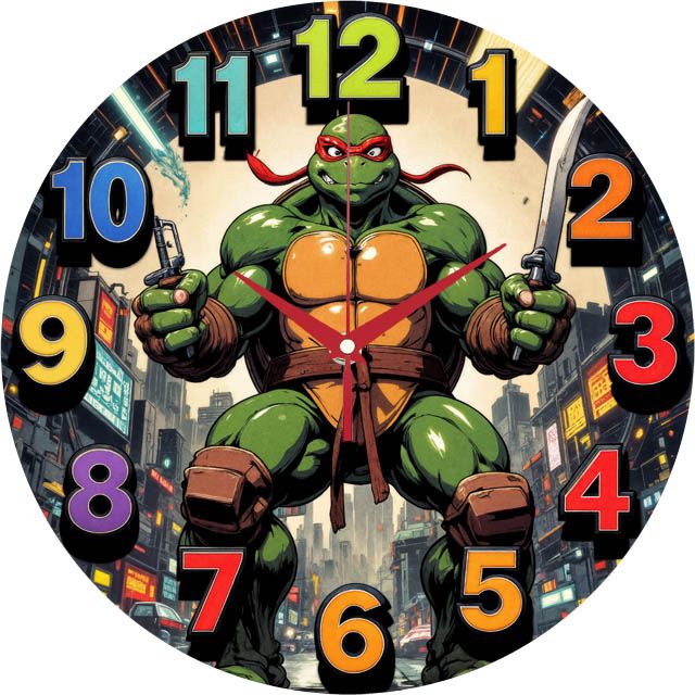 «Черепашка-ниндзя» — драйвовые настенные часы с комикс-сюжетом: герой в боевой стойке на фоне ночного города. Палитра — насыщенный зелёный и янтарно-жёлтый с акцентами красного, графита и неоновых подсветок. По кругу — крупные контрастные разноцветные цифры с объёмной тенью; красные стрелки читаются с первого взгляда. Подходит для детской, подростковой и геймерской, комикс-уголка и коворкинга; отличный подарок фанатам супергероев, ретро-мультсериалов и комиксов. Больше ярких моделей смотрите в подборке настенные часы.
