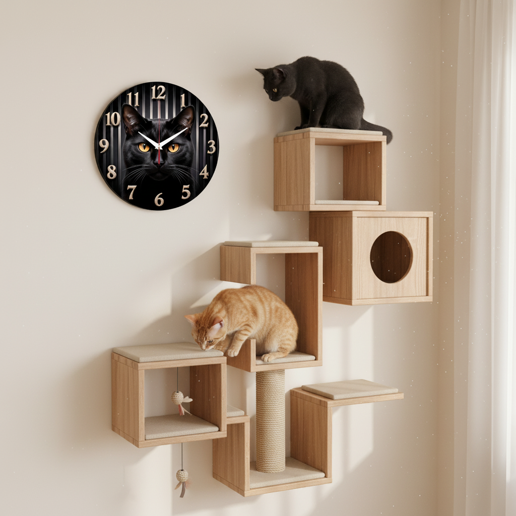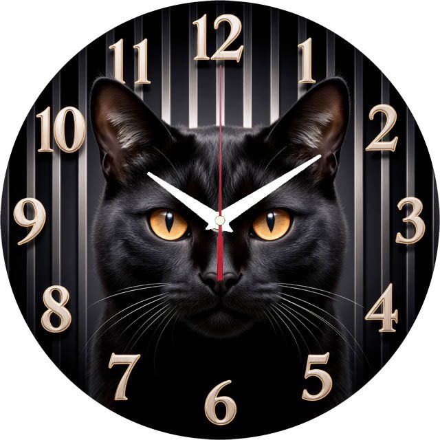 «Чёрный кот» — харизматичные настенные часы с портретом чёрного кота на графичном фоне из вертикальных полос; по кругу — крупные контрастные рельефные цифры с тёплой металлической патиною. В оттенках глубокого чёрного, графитового и бронзового с акцентом янтарных глаз. Светлые стрелки читаются уверенно. Подходит для гостиной, кабинета, прихожей, кофейни/барбершопа и станет эффектным подарком любителям кошек и стиля нуар. Больше подобных сюжетов смотрите в подборке настенные часы.