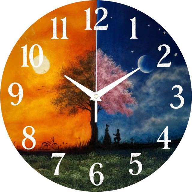 «День-ночь» — романтичные, философские настенные часы с пейзажем, разделённым на день (солнце, велосипед) и ночь (луна, влюблённая пара), символизируя единство противоположностей. Дизайн выполнен в ярких оранжевых и глубоких синих оттенках. Крупные белые цифры и контрастные белые стрелки прекрасно читаются. Подходит для спальни, гостиной и станет прекрасным подарком для влюблённой пары на годовщину, свадьбу или День святого Валентина. Смотрите наш каталог.