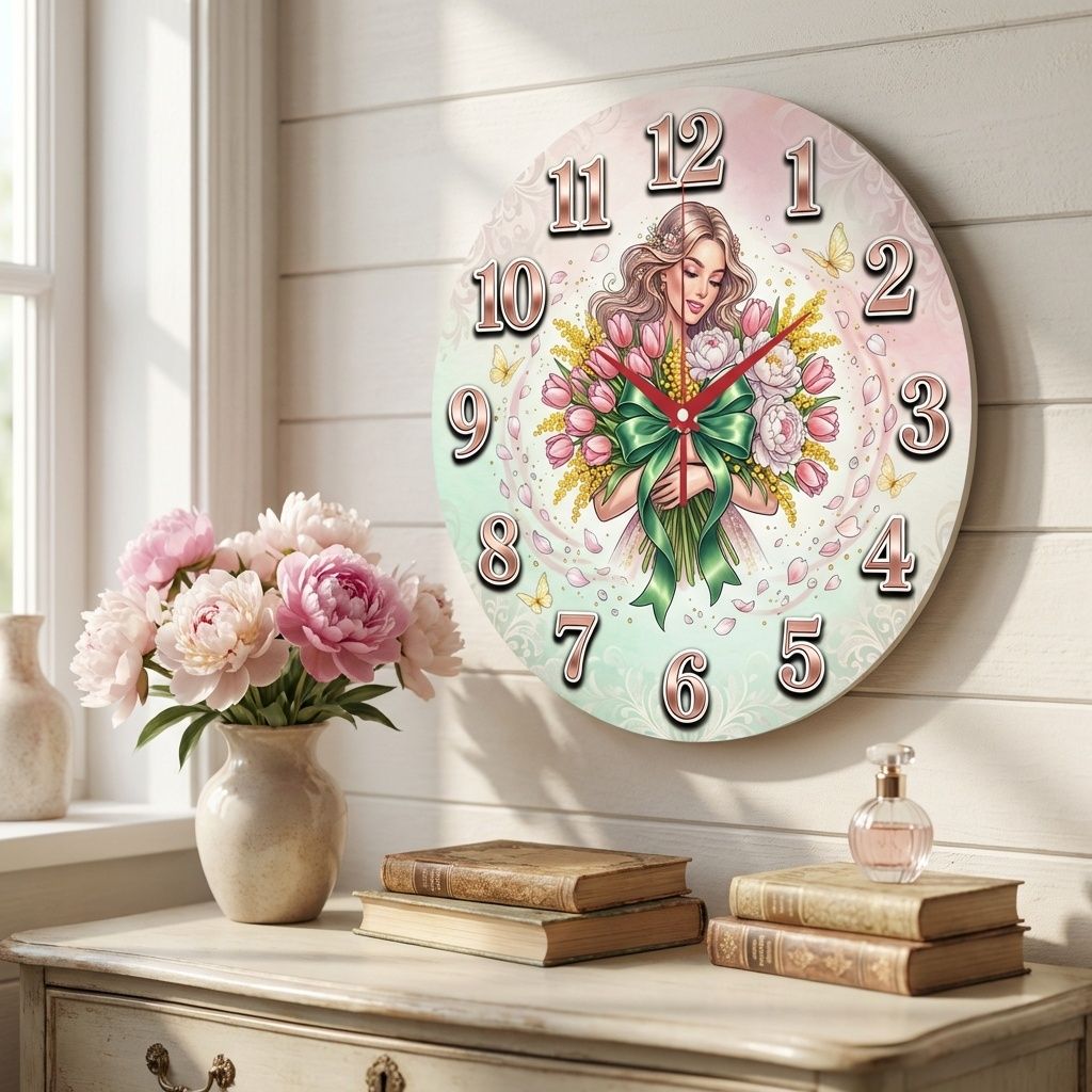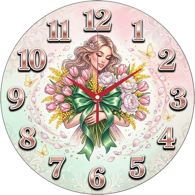 «Девушка с букетом» — Романтичные настенные часы с изображением очаровательной девушки с пышным букетом весенних цветов и порхающими бабочками, выполненные в нежных розовых и пастельно-зеленых оттенках. Крупные цифры с эффектом объема и яркие красные стрелки обеспечивают отличную читаемость времени. Модель идеально подходит в спальню, в гостинную или в комнату и станет отличным подарком к 8 марта для ваших близких, поэтому предлагаем вам эти часы купить на стену.