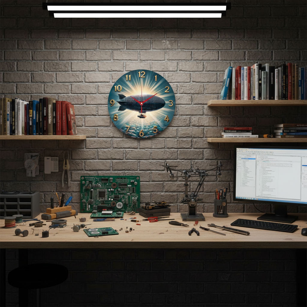 «Дирижабль» — атмосферные настенные часы с романтикой ретро-путешествий: над облаками плывёт дирижабль у лучистого горизонта; по кругу — крупные контрастные золотистые рельефные цифры. В оттенках небесно-синего, бирюзового, стально-серого та тёплого золота. Лаконичные тёмные стрелки читаются уверенно. Подходит для гостиной, кабинета, лофта, офиса или кофейни и станет удачным подарком любителям винтажной авиации, мандрів і стімпанк-естетики. Если откликается такая «небесная» тема, присмотритесь к подборке оригинальные настенные часы.