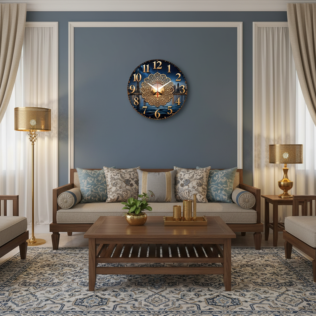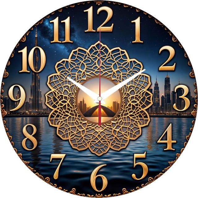 «Дубай» — роскошные настенные часы с панорамой ночного мегаполиса и изысканным золотым орнаментом в центре в глубоких синих и золотых оттенках. Крупные золотые цифры и контрастные белые стрелки прекрасно читаются на тёмном фоне. Подходит для современной гостиной, кабинета или интерьера в восточном стиле и станет впечатляющим подарком для любителей путешествий и роскоши. Смотрите все настенные часы в нашем каталоге.
