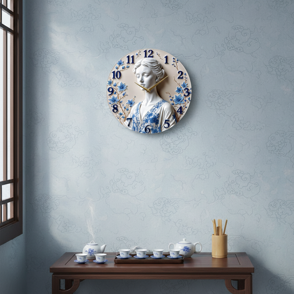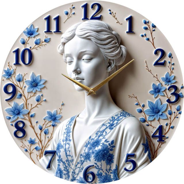 «Фарфоровая грация» — утончённые интерьерные настенные часы с изящным портретом в духе фарфоровой пластики: бело-перламутрова фігура, обрамлённая голубыми цветами та тонкими веточками; по кругу — крупные контрастные рельефные цифры глубокого кобальтового оттенка. В оттенках молочно-бежевого, кобальтово-синего и тёплого золота. Золотистые стрелки читаются уверенно. Подходит для спальни, гостиной, бутик-студии, салона красоты и станет елегантным подарком ценителям классики и декоративного искусства. Чтобы поддержать такой декоративный акцент, загляните в подборку декоративные настенные часы.