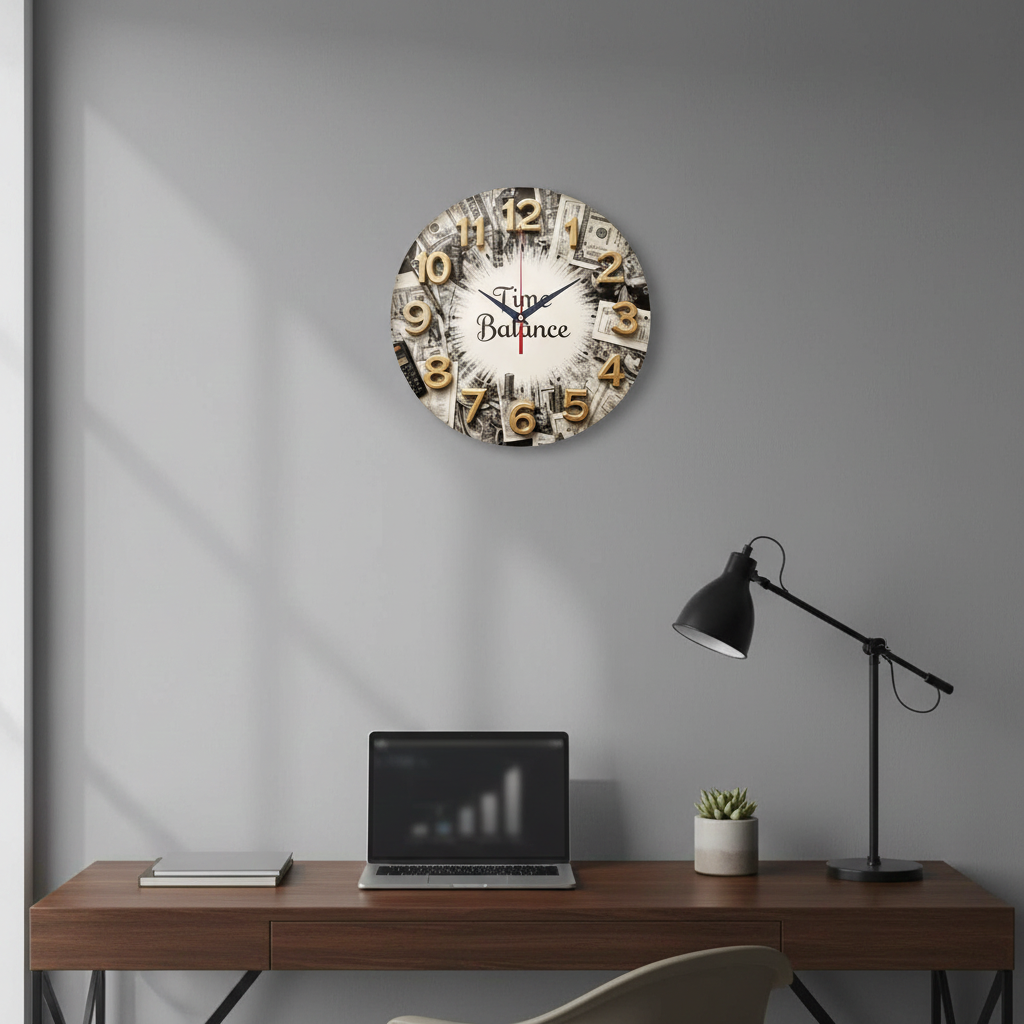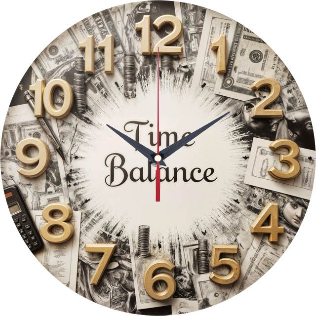 «Финансовый успех» — мотивирующие, деловые настенные часы с коллажем на тему финансов (доллары, монеты, "Time Balance") в монохромных и золотых оттенках. Крупные золотистые цифры и контрастные тёмные стрелки прекрасно читаются. Подходит для офиса, кабинета, банка или бухгалтерии и станет отличным подарком для финансиста, предпринимателя или босса. Смотрите полный список настенных часов.