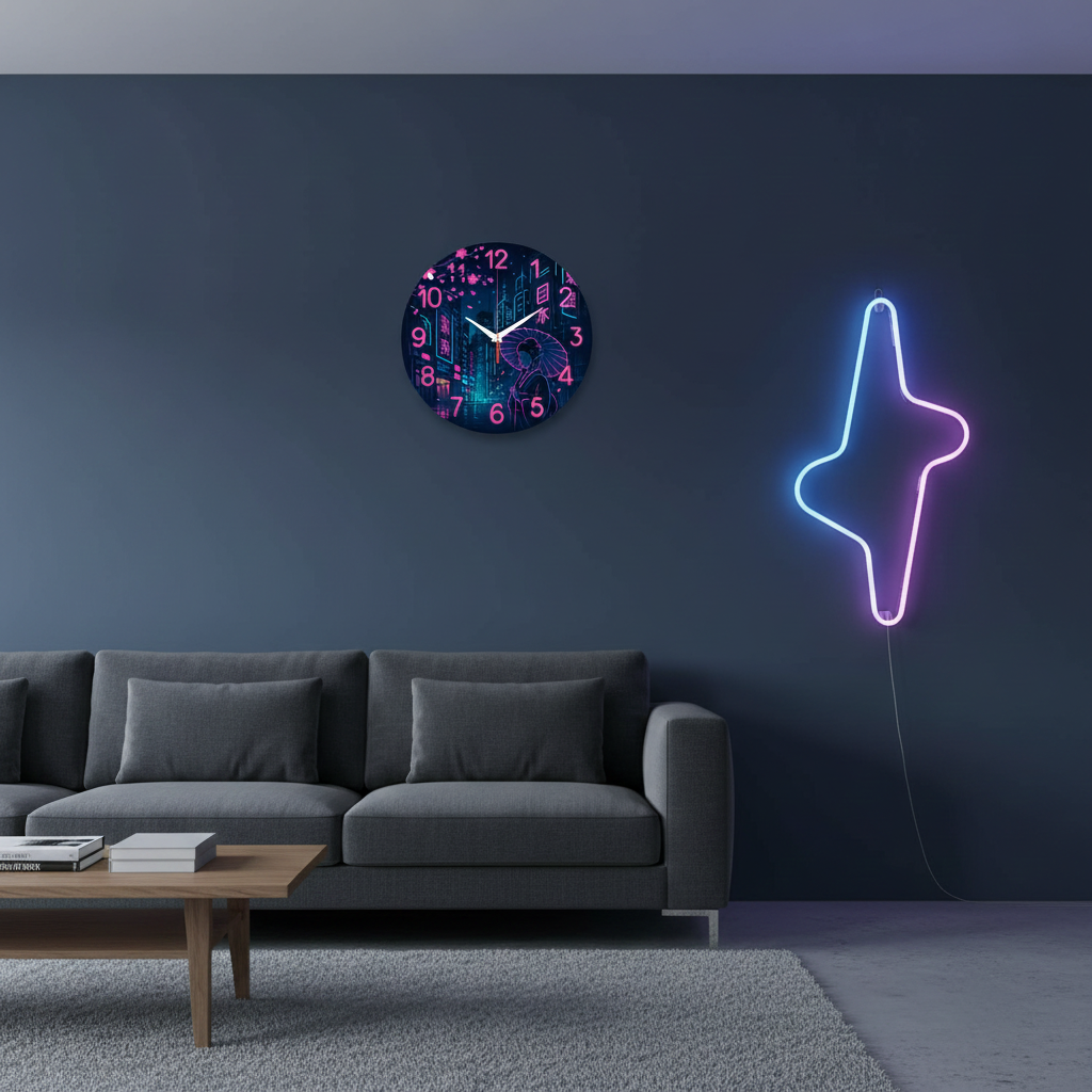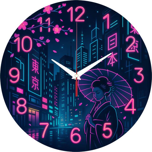 «Гейша в неоне» — завораживающие настенные часы с пейзажем ночного Токио, гейшей и сакурой в ярких неоновых розовых и бирюзовых оттенках. "Светящиеся" цифры и контрастные белые стрелки отлично видны на тёмном фоне в стиле киберпанк. Подходит для современной гостиной, комнаты подростка или тематического кафе и станет отличным подарком для поклонников японской культуры. Смотрите всю категорию настенных часов.